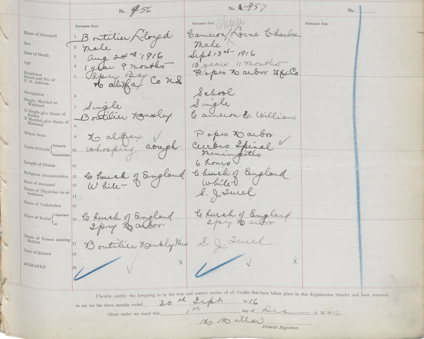 Male Death Registration: Year: 1916 book: 34 page: 291 number: 956