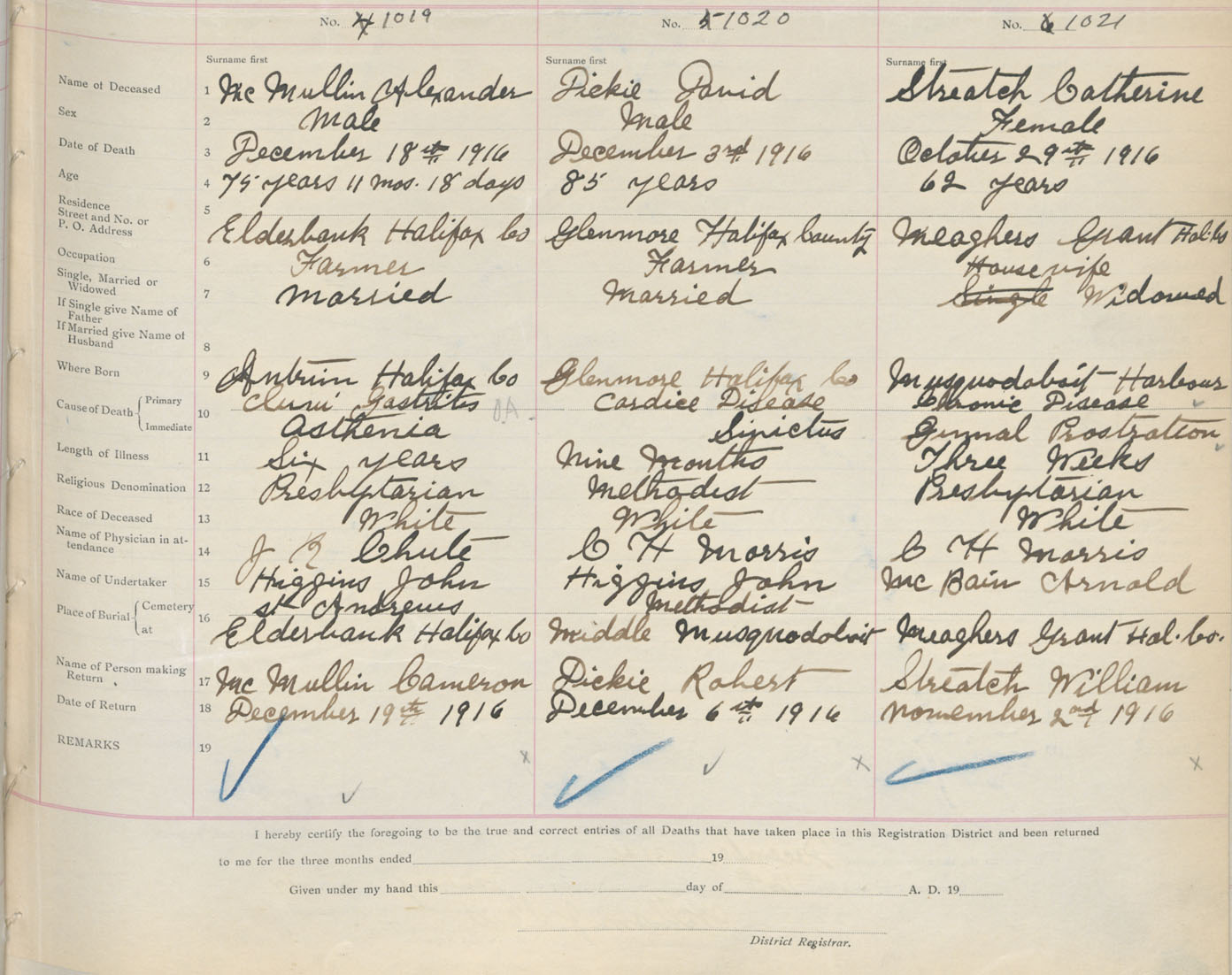 Male Death Registration: Year: 1916 book: 34 page: 313 number: 1019
