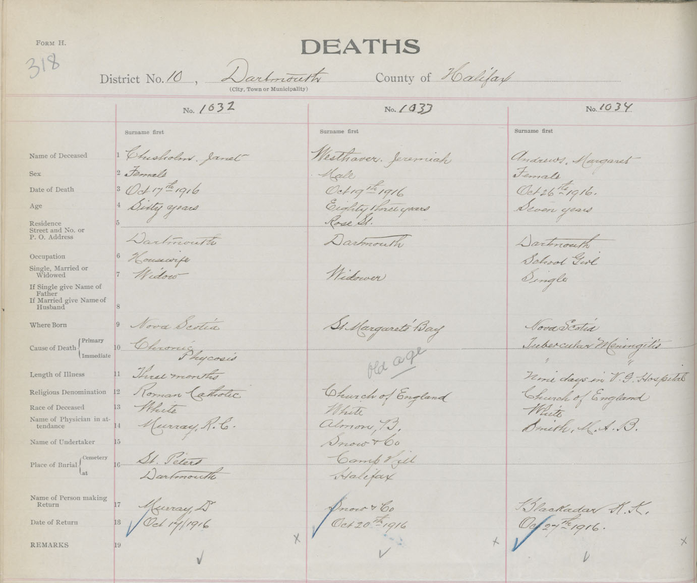 Female Death Registration: Year: 1916 book: 34 page: 318 number: 1032