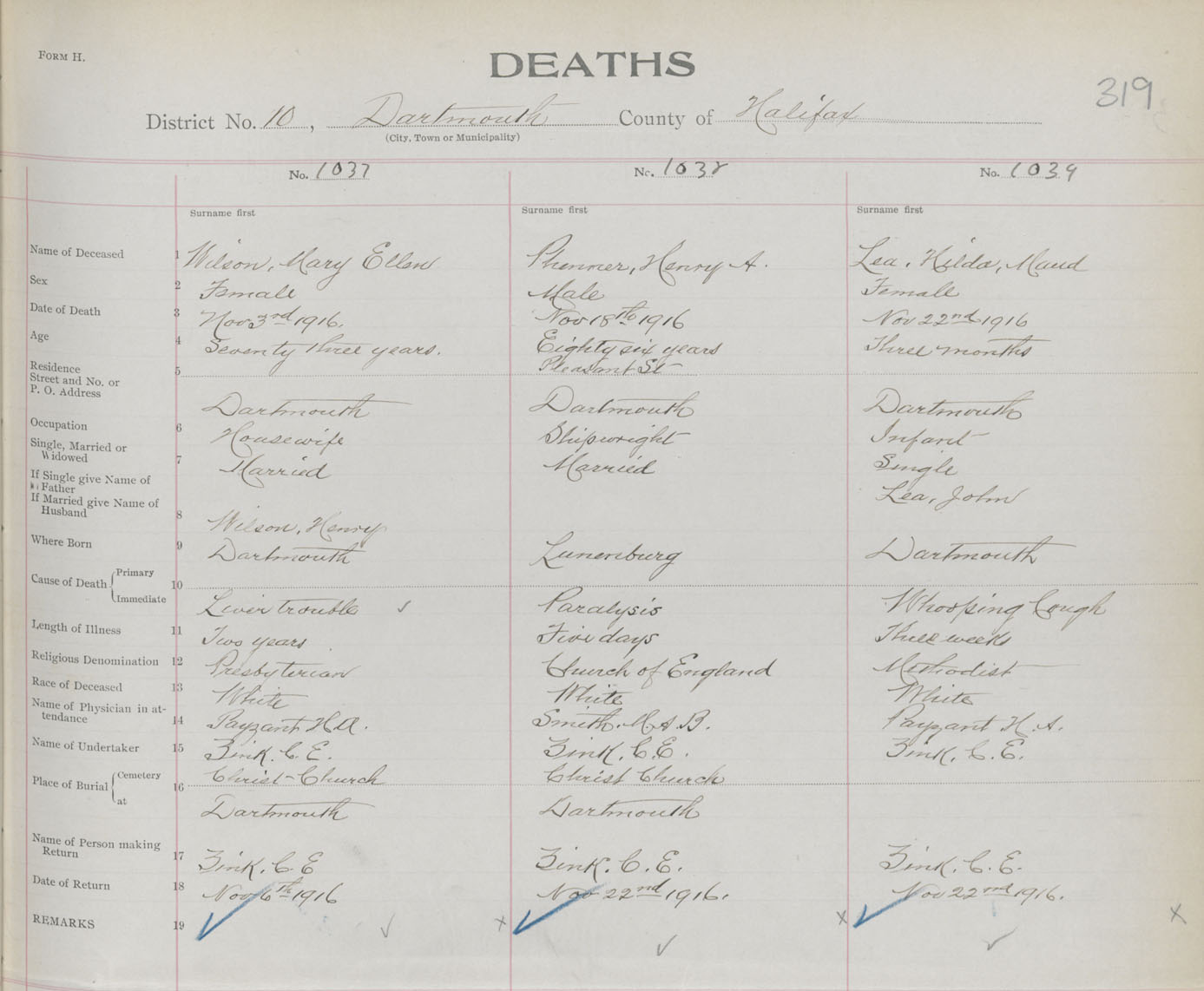Female Death Registration: Year: 1916 book: 34 page: 319 number: 1037