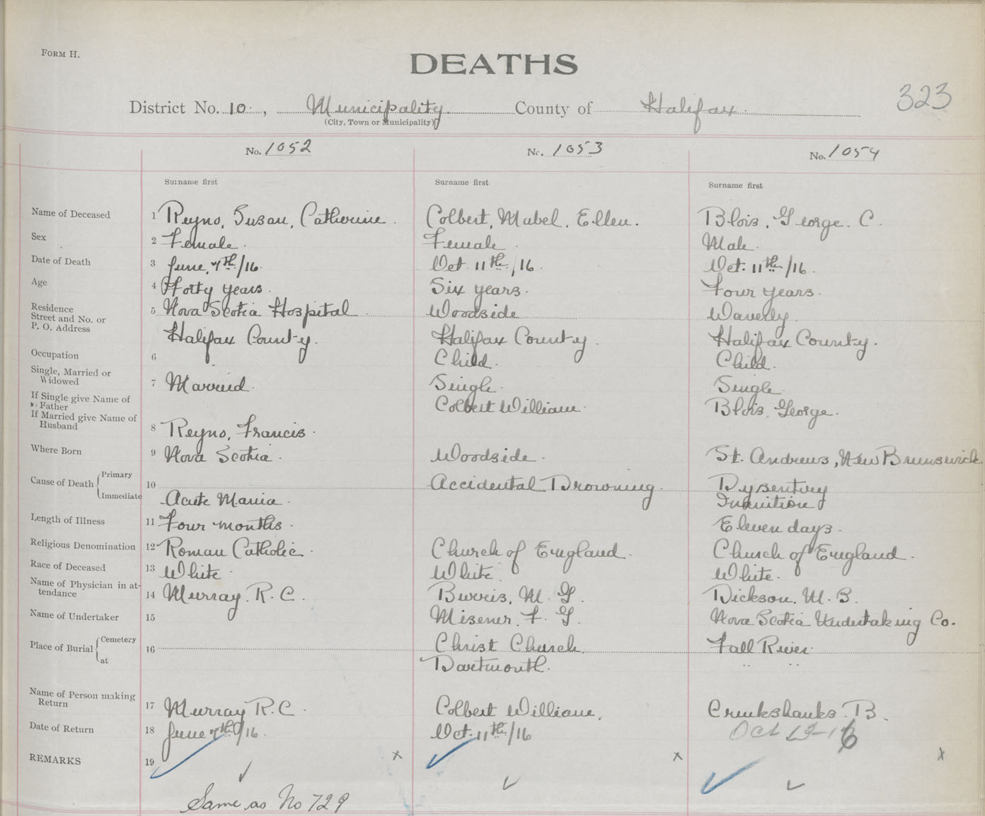 Female Death Registration: Year: 1916 book: 34 page: 323 number: 1052