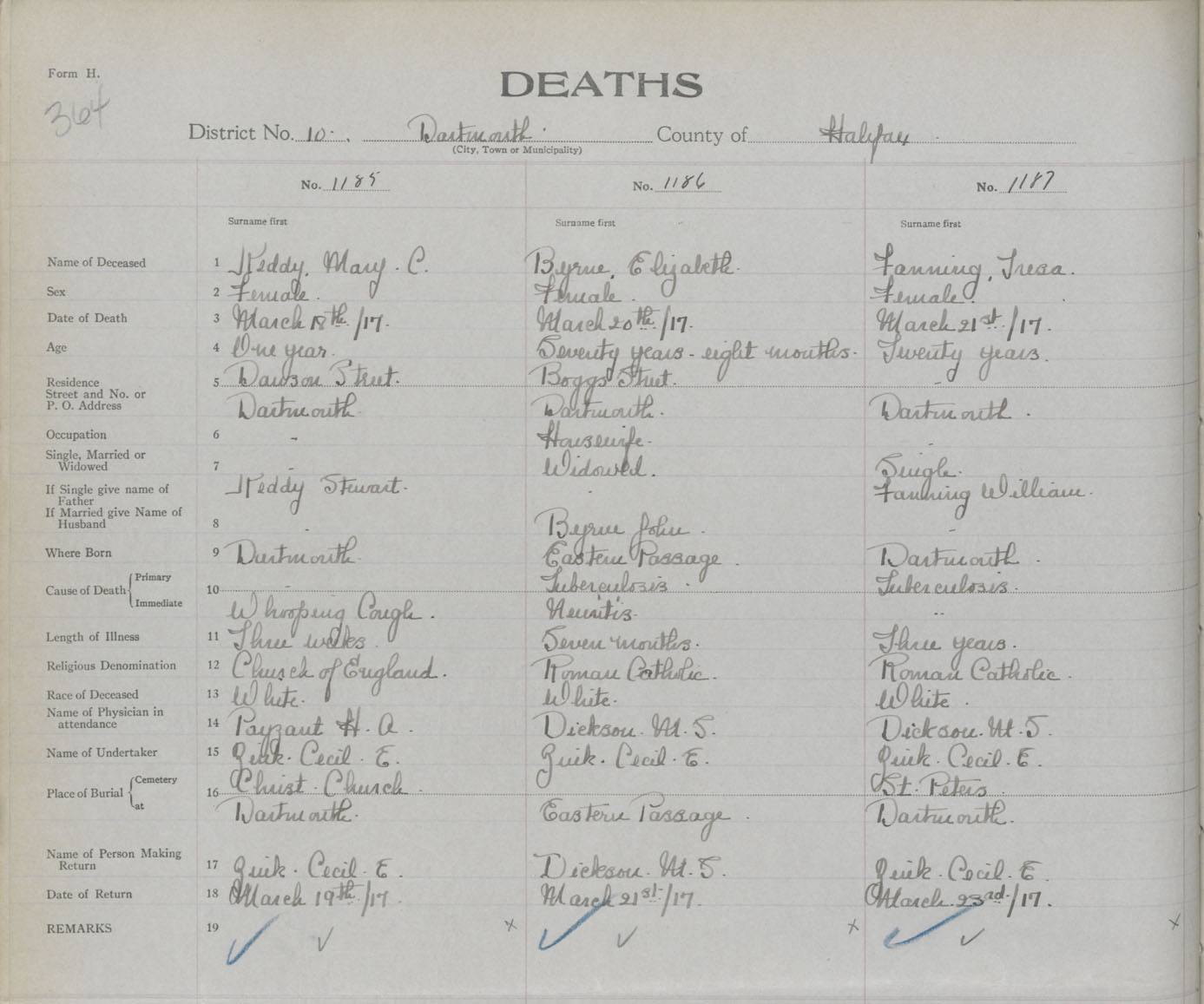 Female Death Registration: Year: 1917 book: 34 page: 364 number: 1185