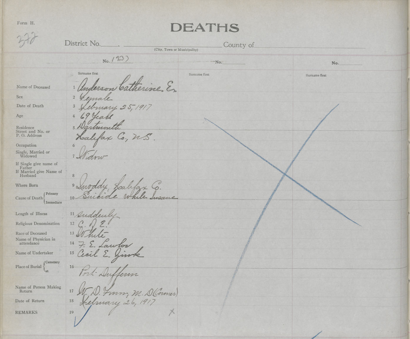 Female Death Registration: Year: 1917 book: 34 page: 372 number: 1233