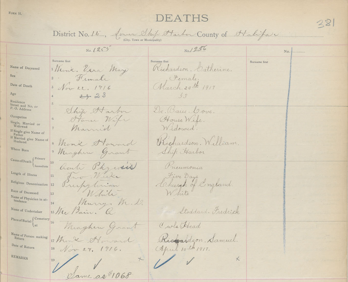 Female Death Registration: Year: 1916 book: 34 page: 381 number: 1255