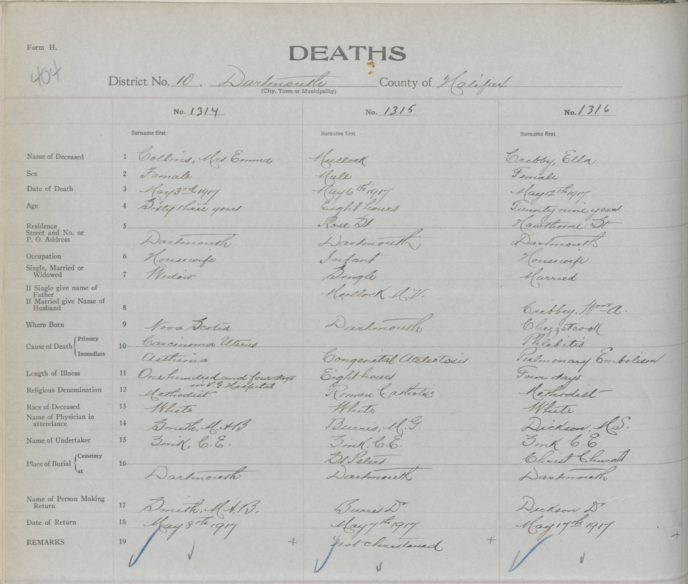 Female Death Registration: Year: 1917 book: 34 page: 404 number: 1314