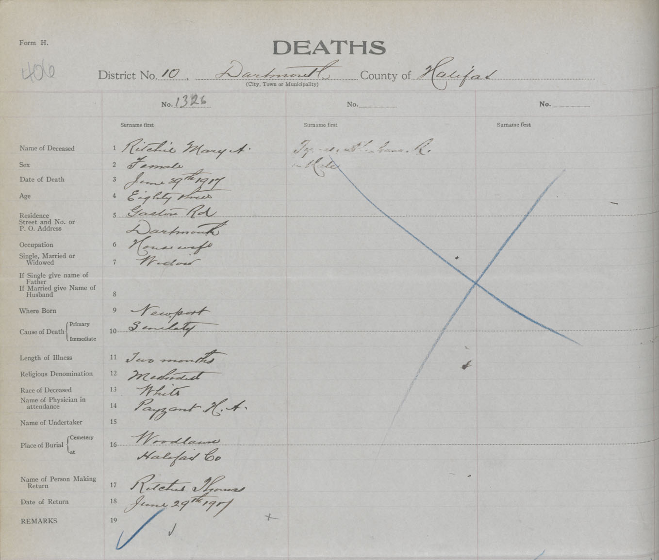 Female Death Registration: Year: 1917 book: 34 page: 406 number: 1326