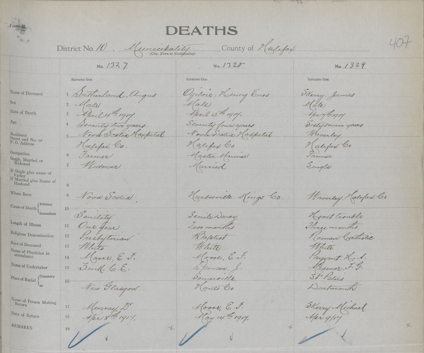 Male Death Registration: Year: 1917 book: 34 page: 407 number: 1327