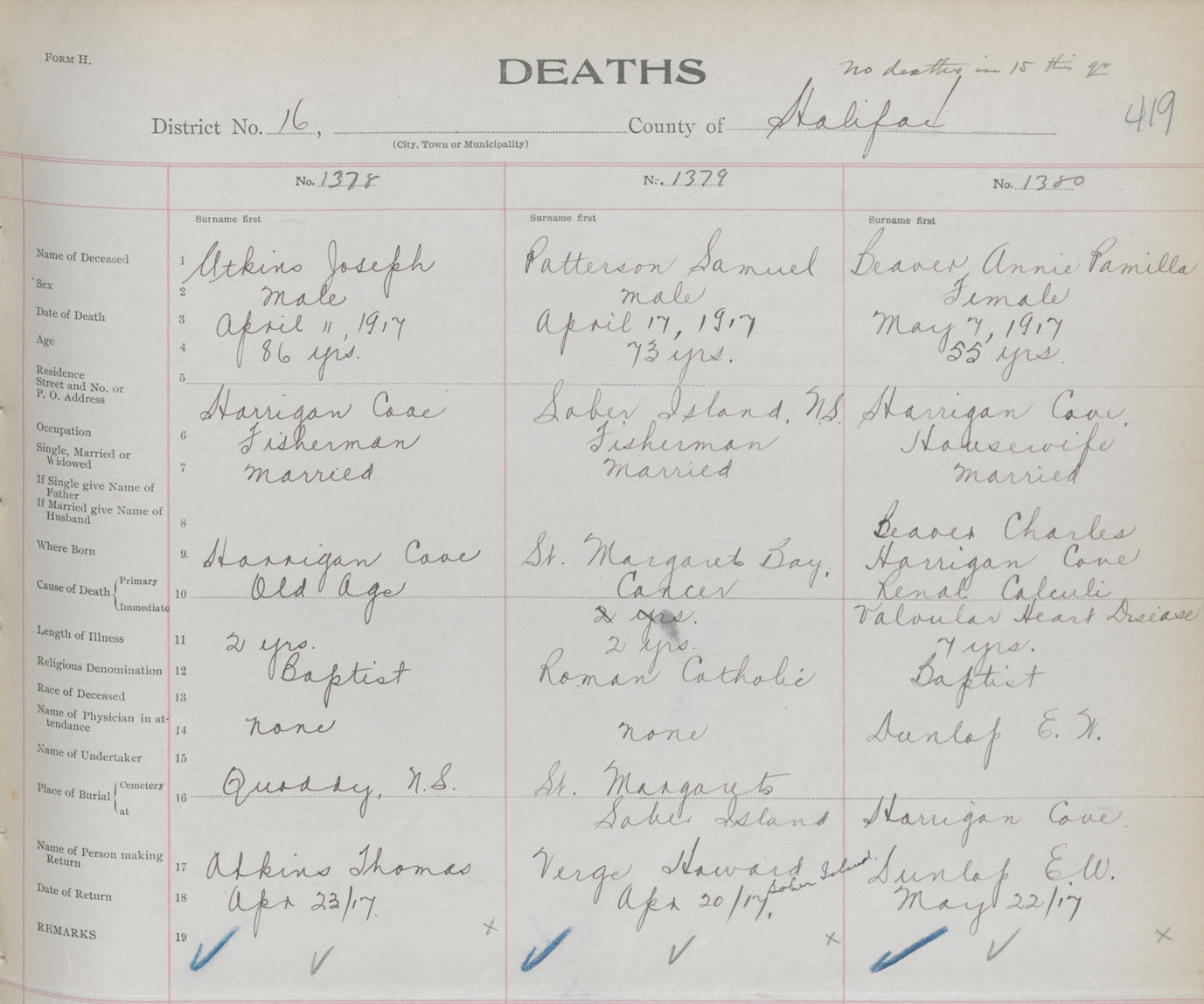 Male Death Registration: Year: 1917 book: 34 page: 419 number: 1378