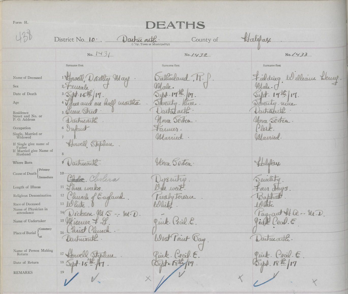 Male Death Registration: Year: 1917 book: 34 page: 438 number: 1433