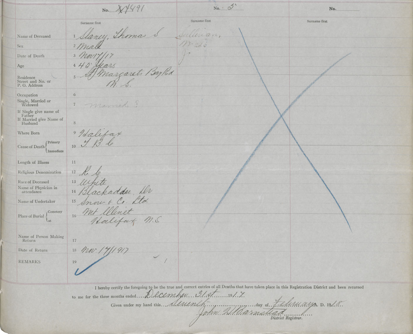 Male Death Registration: Year: 1917 book: 34 page: 459 number: 1491