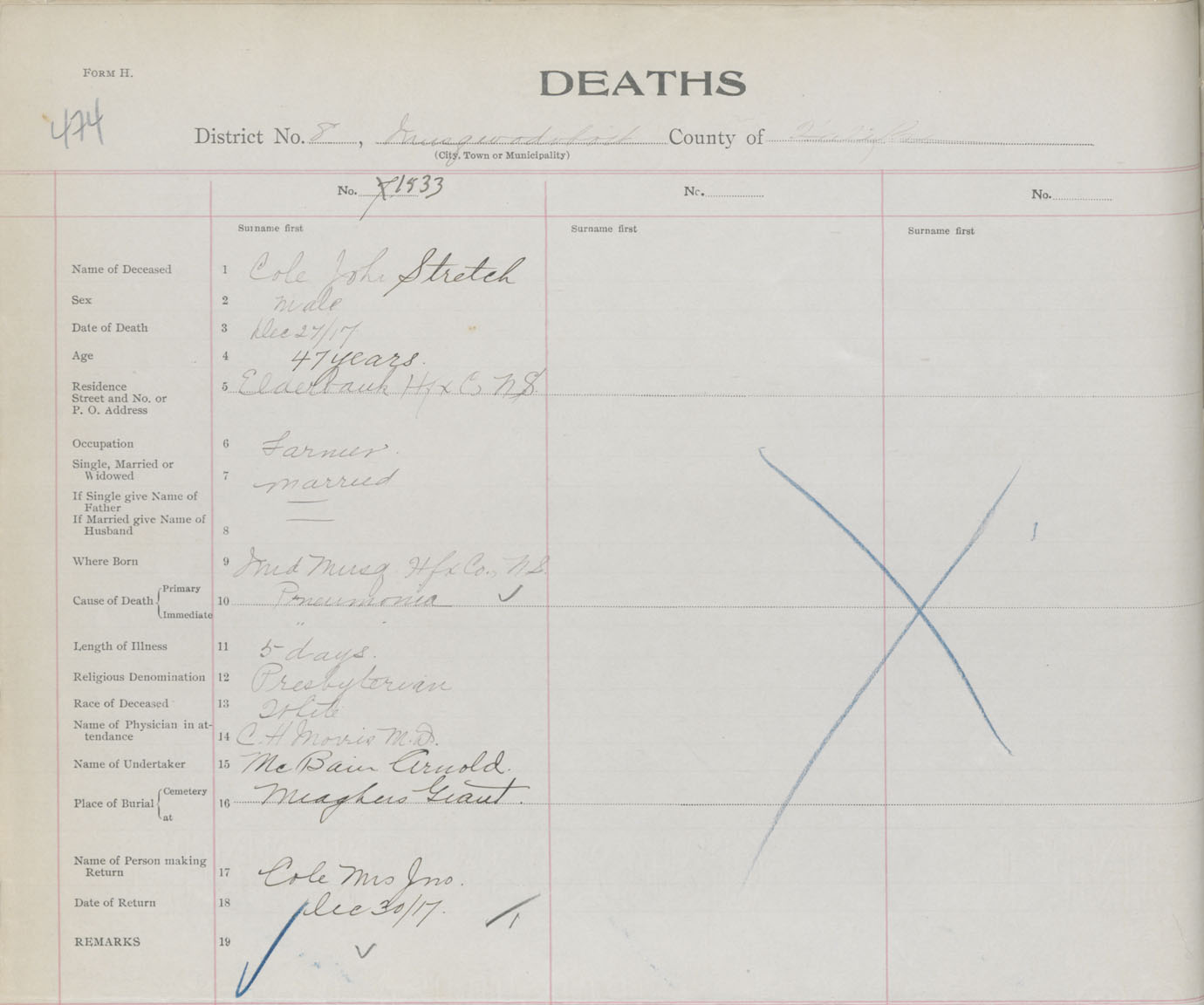 Male Death Registration: Year: 1917 book: 34 page: 474 number: 1533