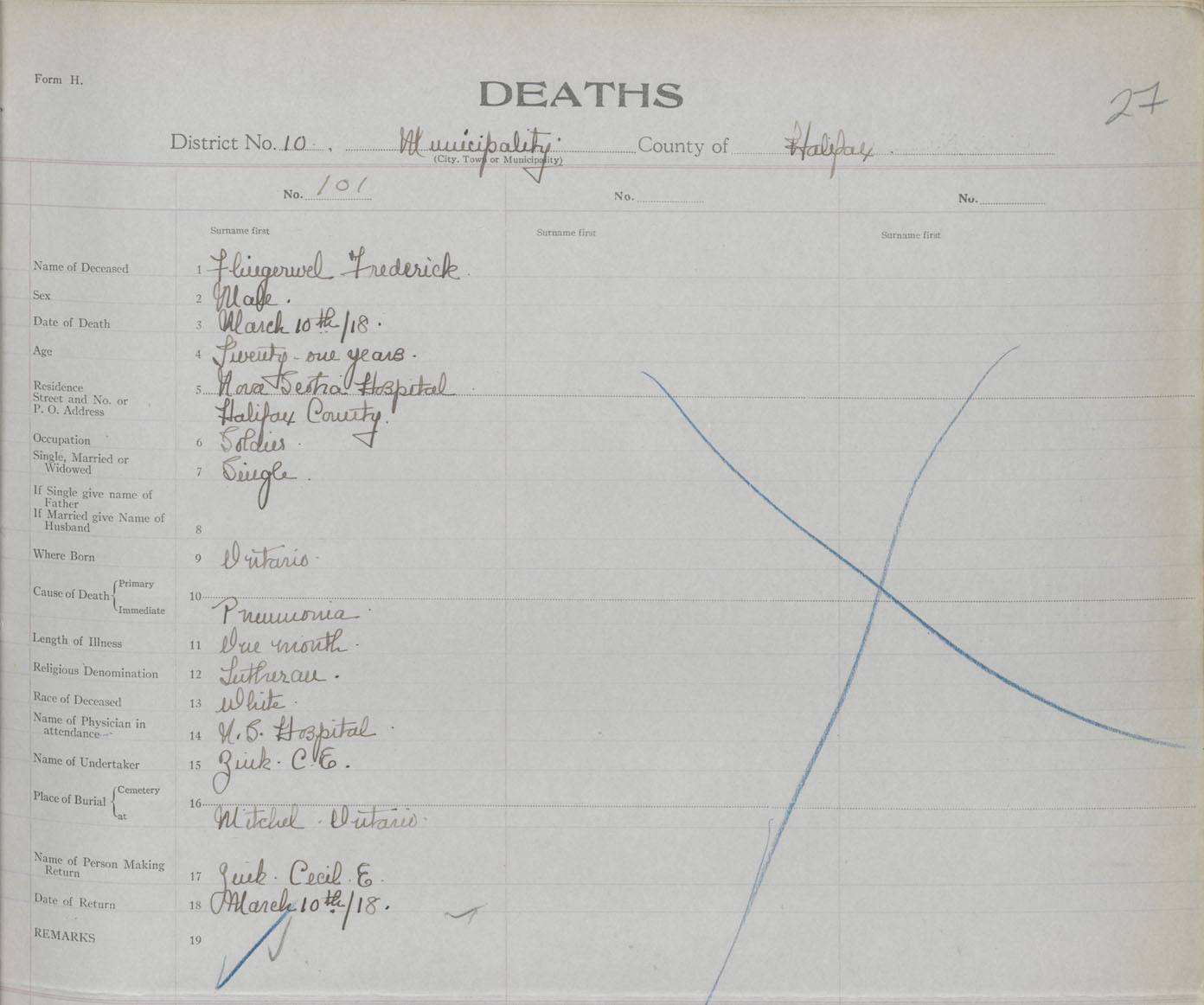 Male Death Registration: Year: 1918 book: 35 page: 27 number: 101