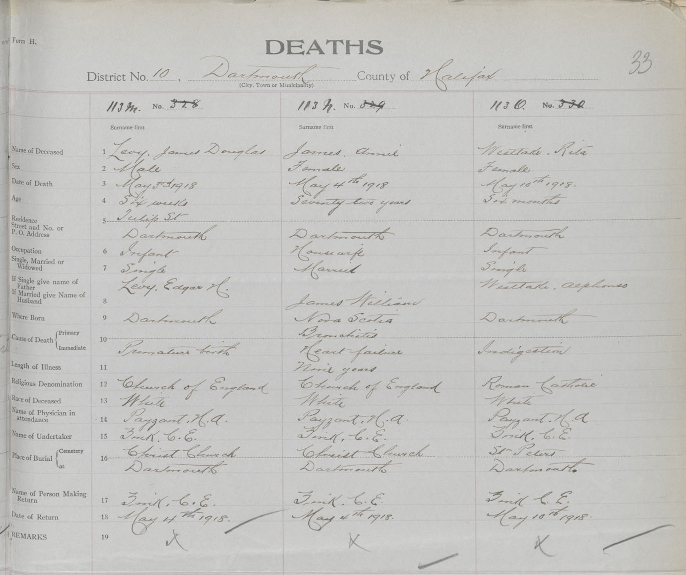 Male Death Registration: Year: 1918 book: 35 page: 33 number: 113