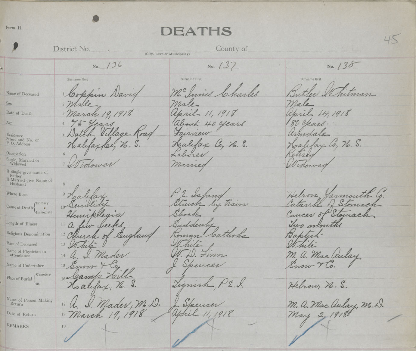 Male Death Registration: Year: 1918 book: 35 page: 45 number: 136