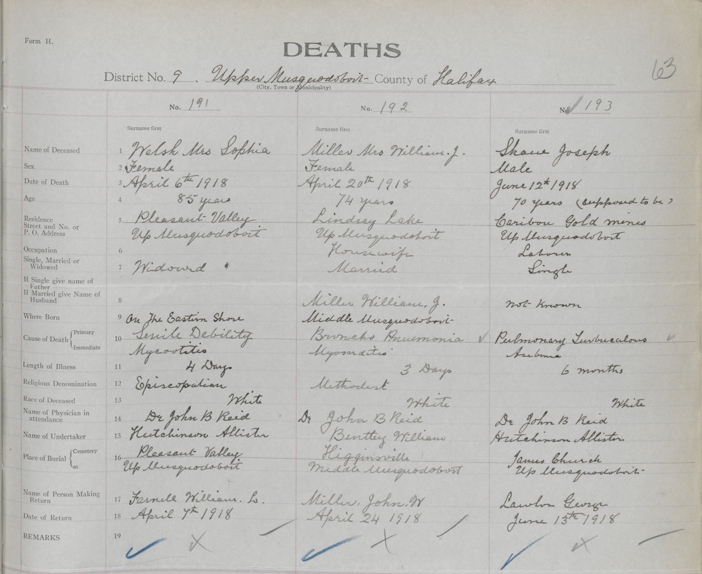 Female Death Registration: Year: 1918 book: 35 page: 63 number: 191