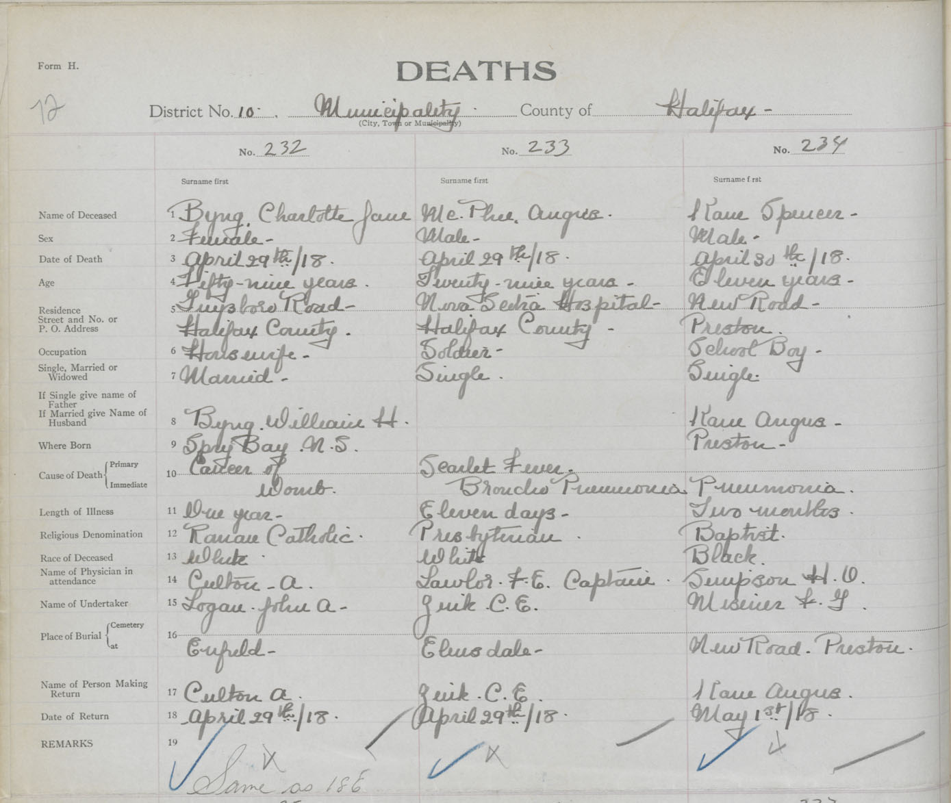 Female Death Registration: Year: 1918 book: 35 page: 72 number: 232