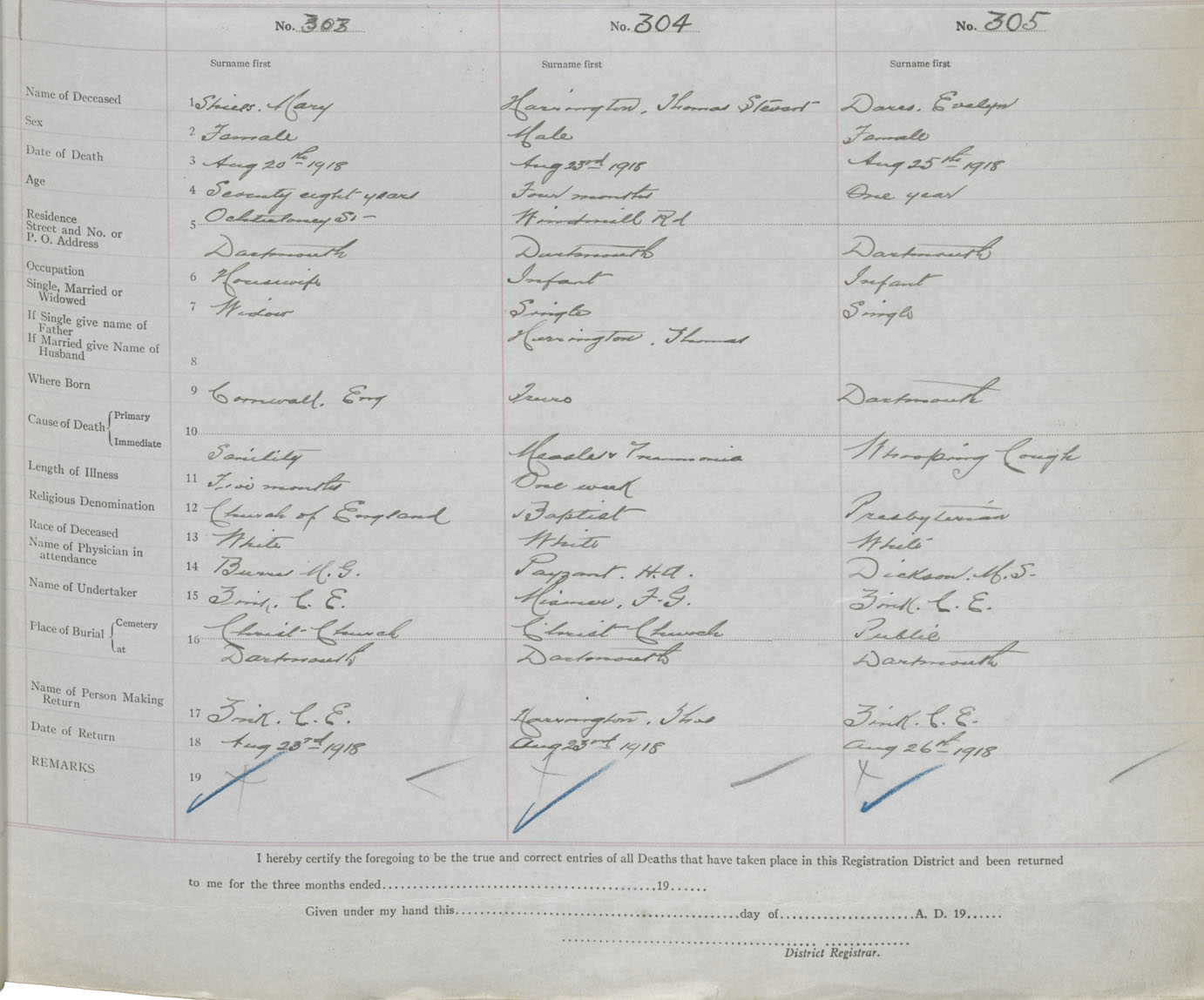Female Death Registration: Year: 1918 book: 35 page: 95 number: 305