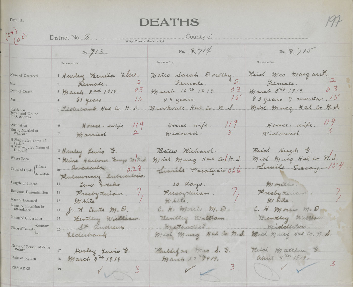 Death Registration: Year: 1919 book: 35 page: 197 number: 713