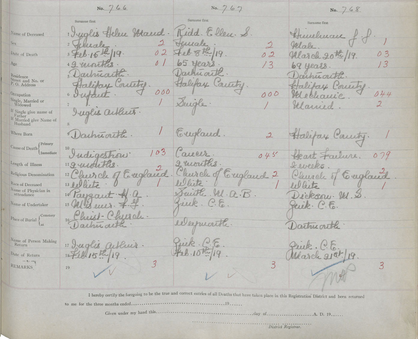 Death Registration: Year: 1919 book: 35 page: 207 number: 766