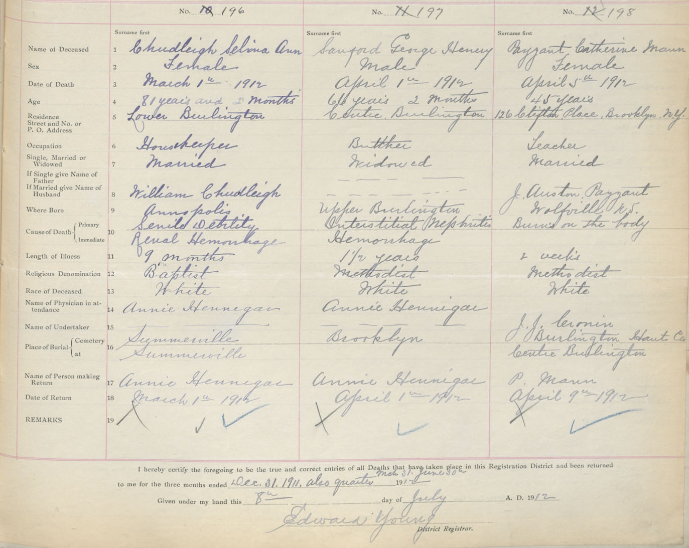 Female Death Registration: Year: 1912 book: 35 page: 409 number: 196