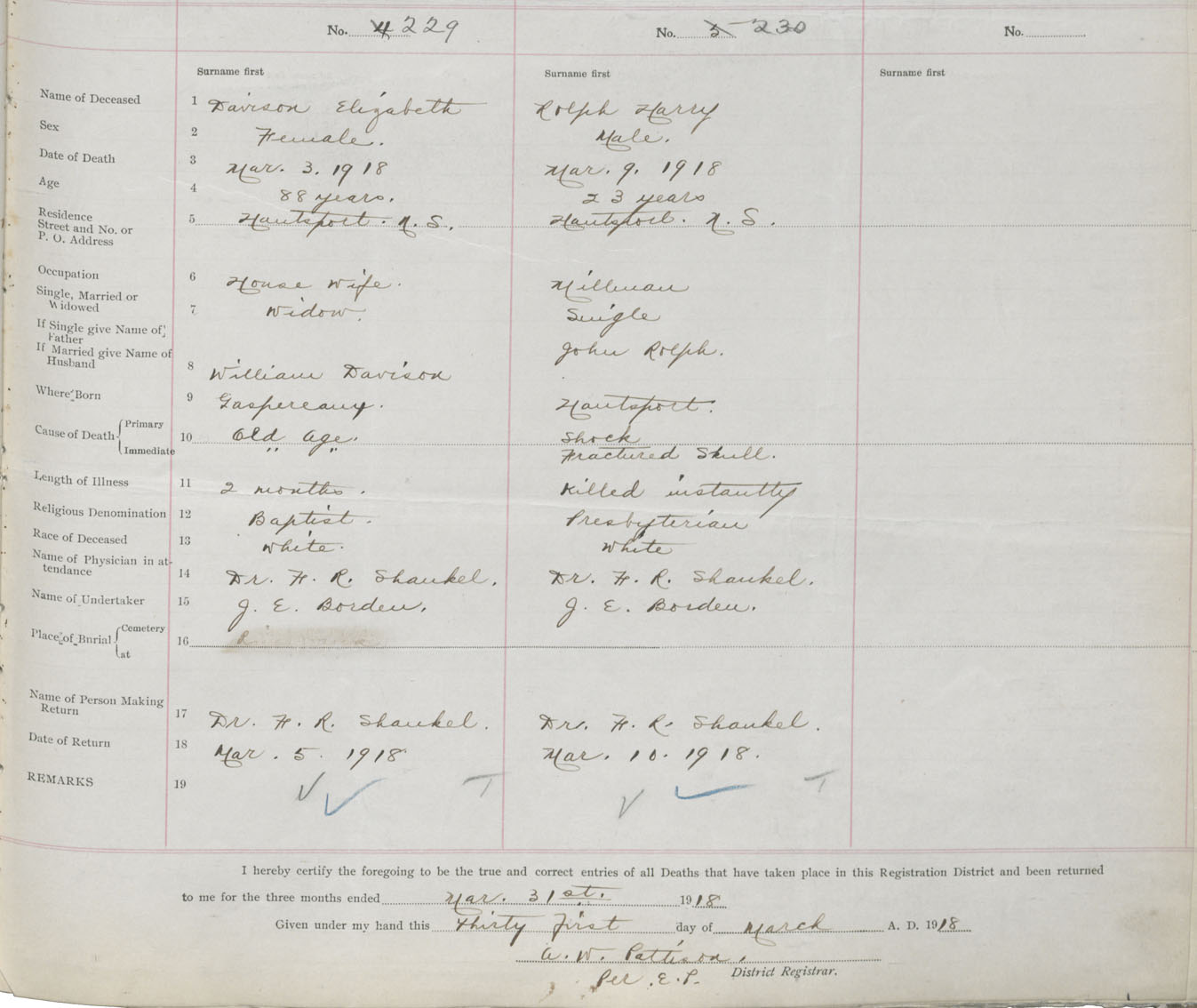 Male Death Registration: Year: 1918 book: 35 page: 417 number: 230