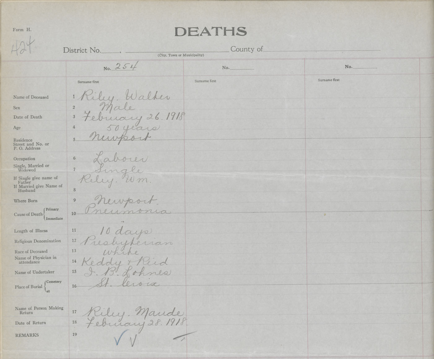 Male Death Registration: Year: 1918 book: 35 page: 424 number: 254