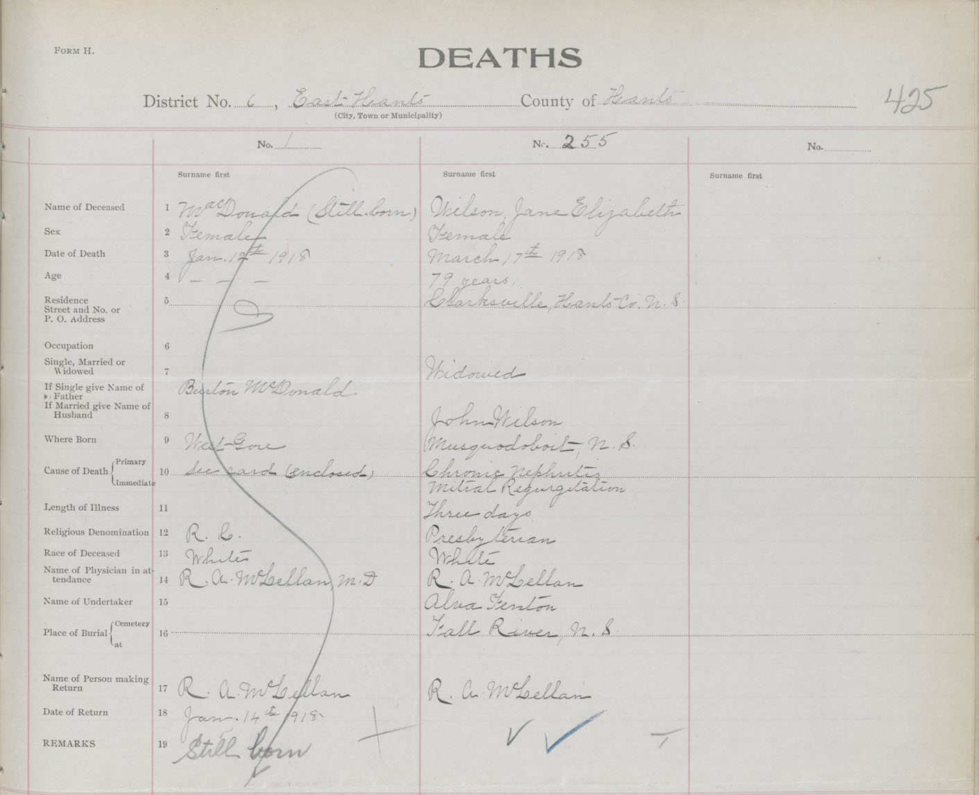 Female Death Registration: Year: 1918 book: 35 page: 425 number: 255
