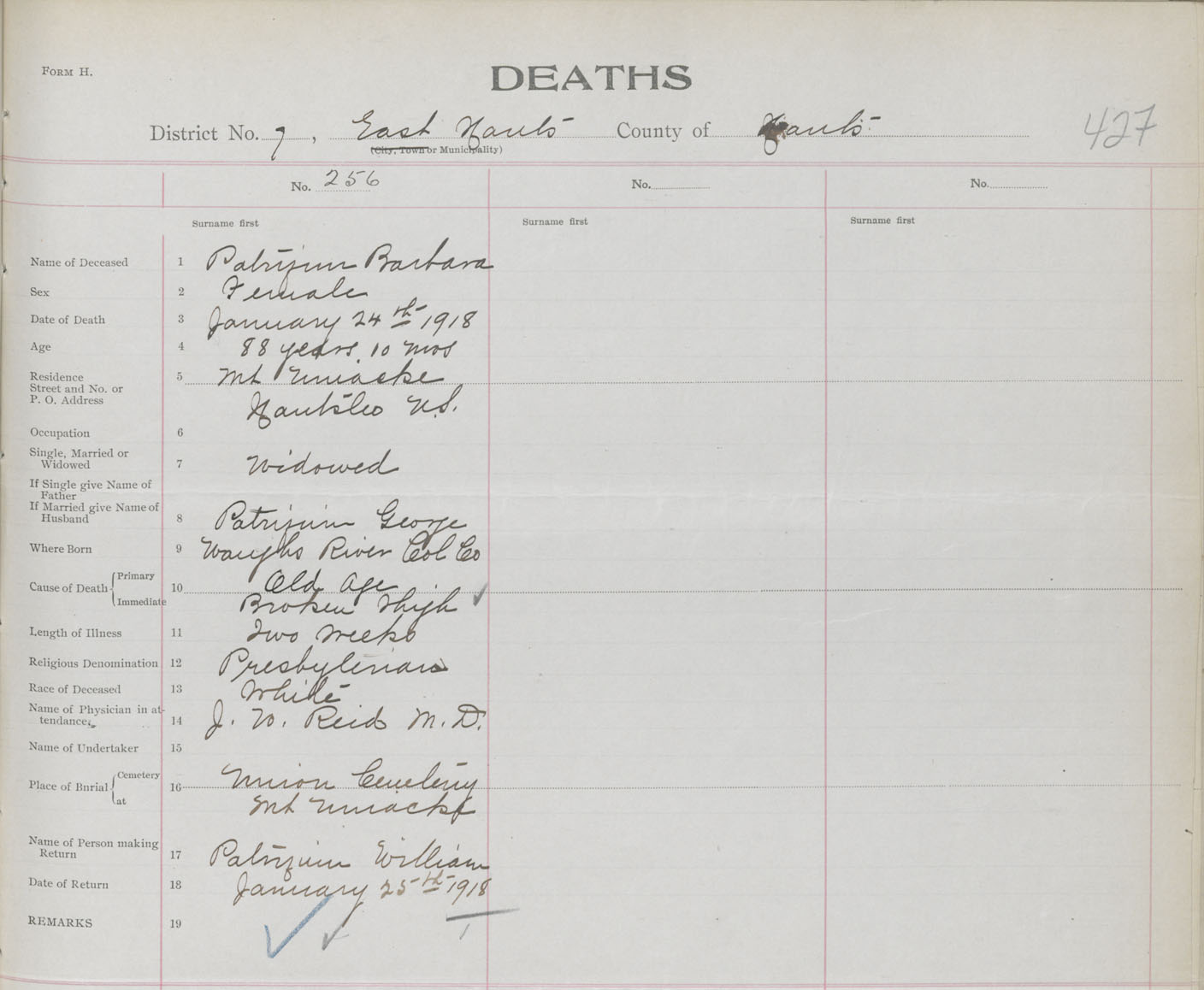 Female Death Registration: Year: 1918 book: 35 page: 427 number: 256