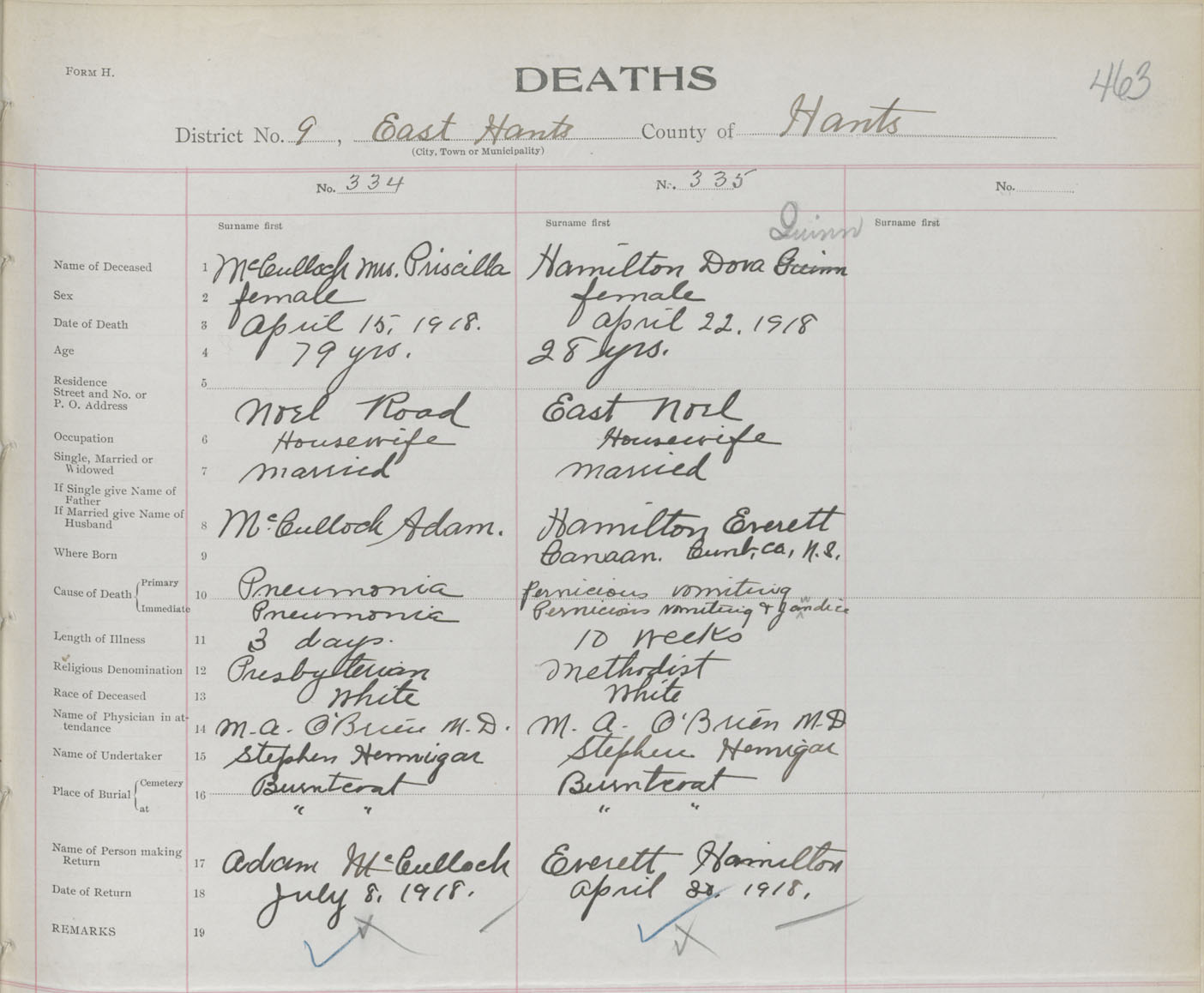 Female Death Registration: Year: 1918 book: 35 page: 463 number: 334