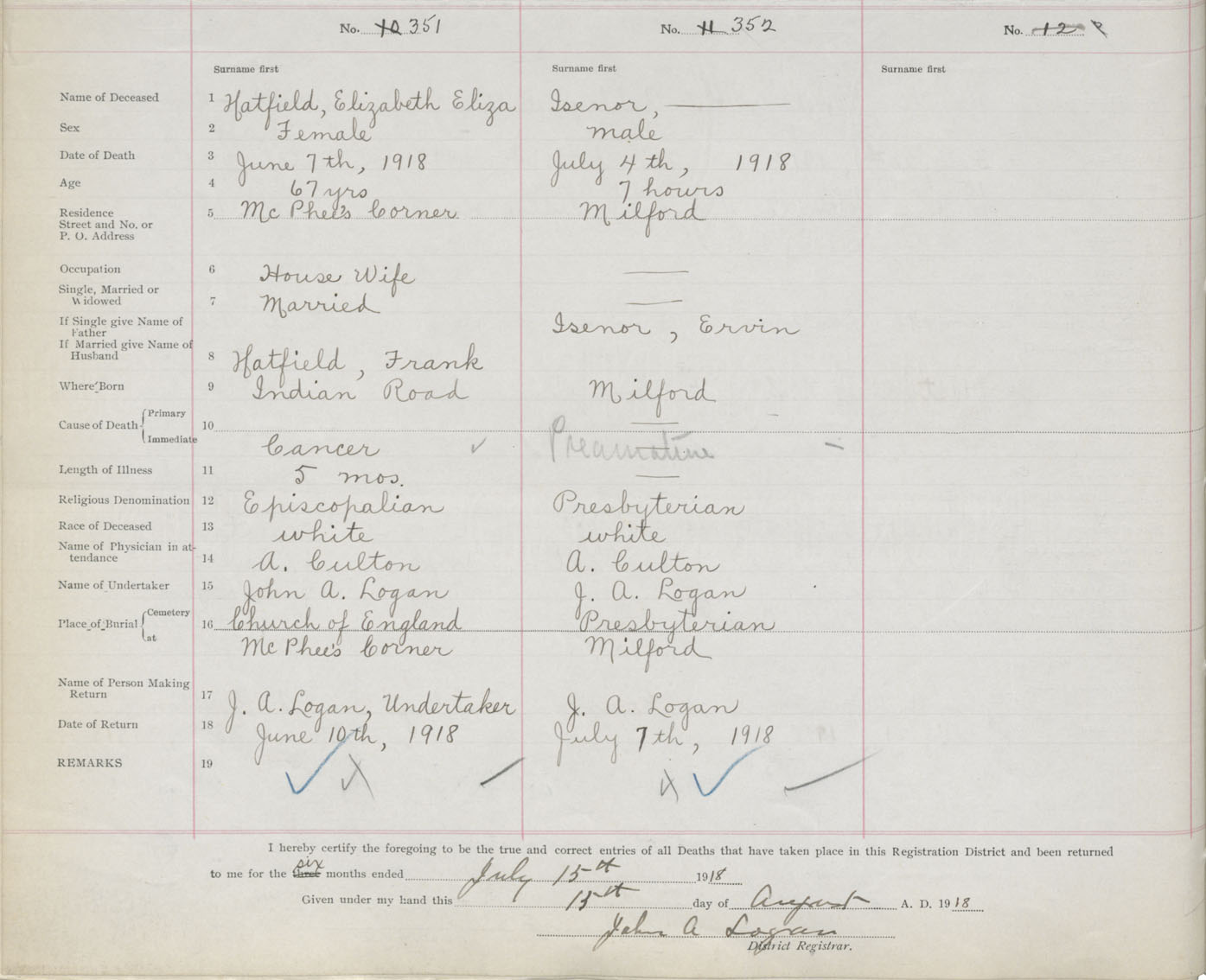 Female Death Registration: Year: 1918 book: 35 page: 468 number: 351