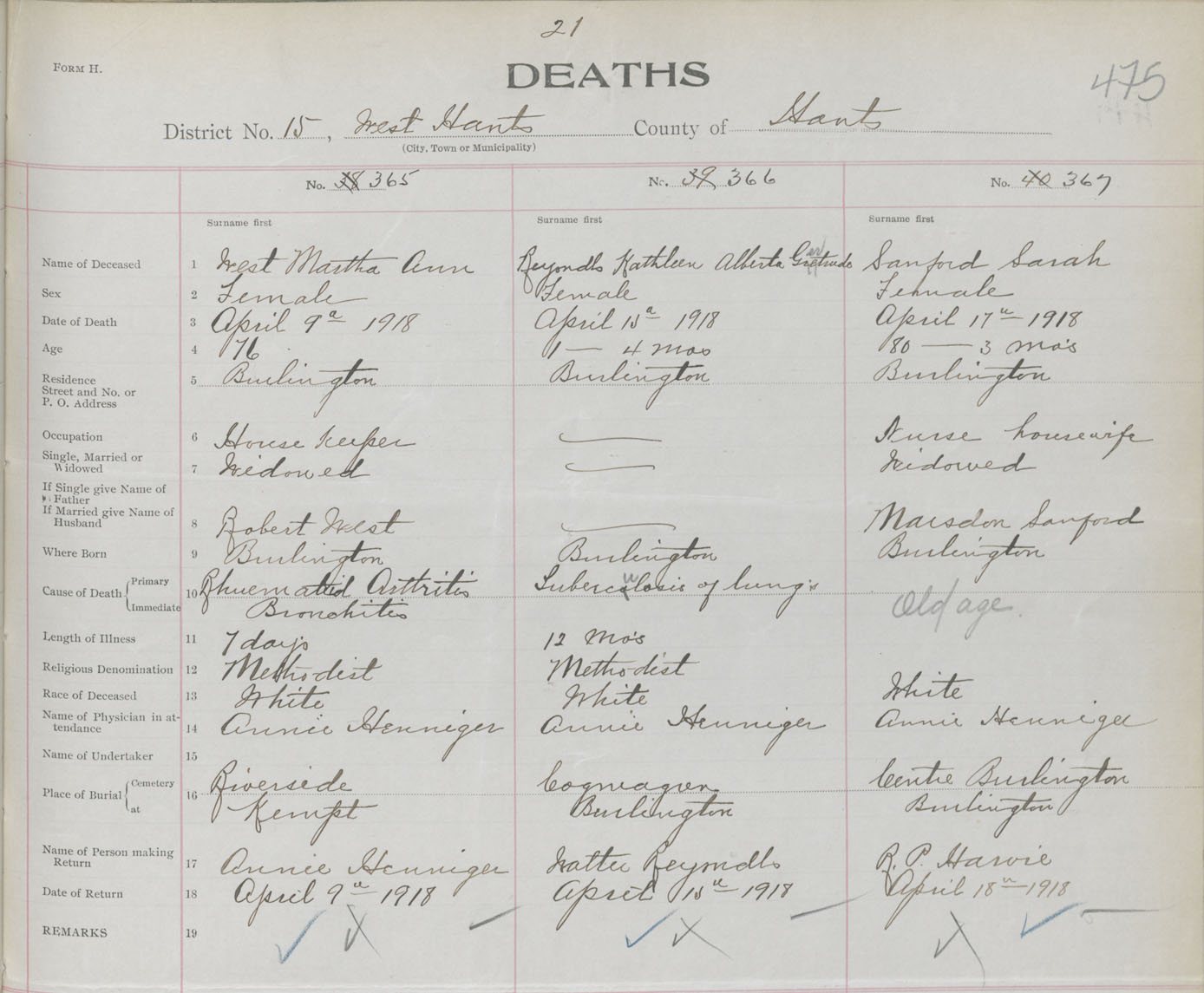 Female Death Registration: Year: 1918 book: 35 page: 475 number: 365
