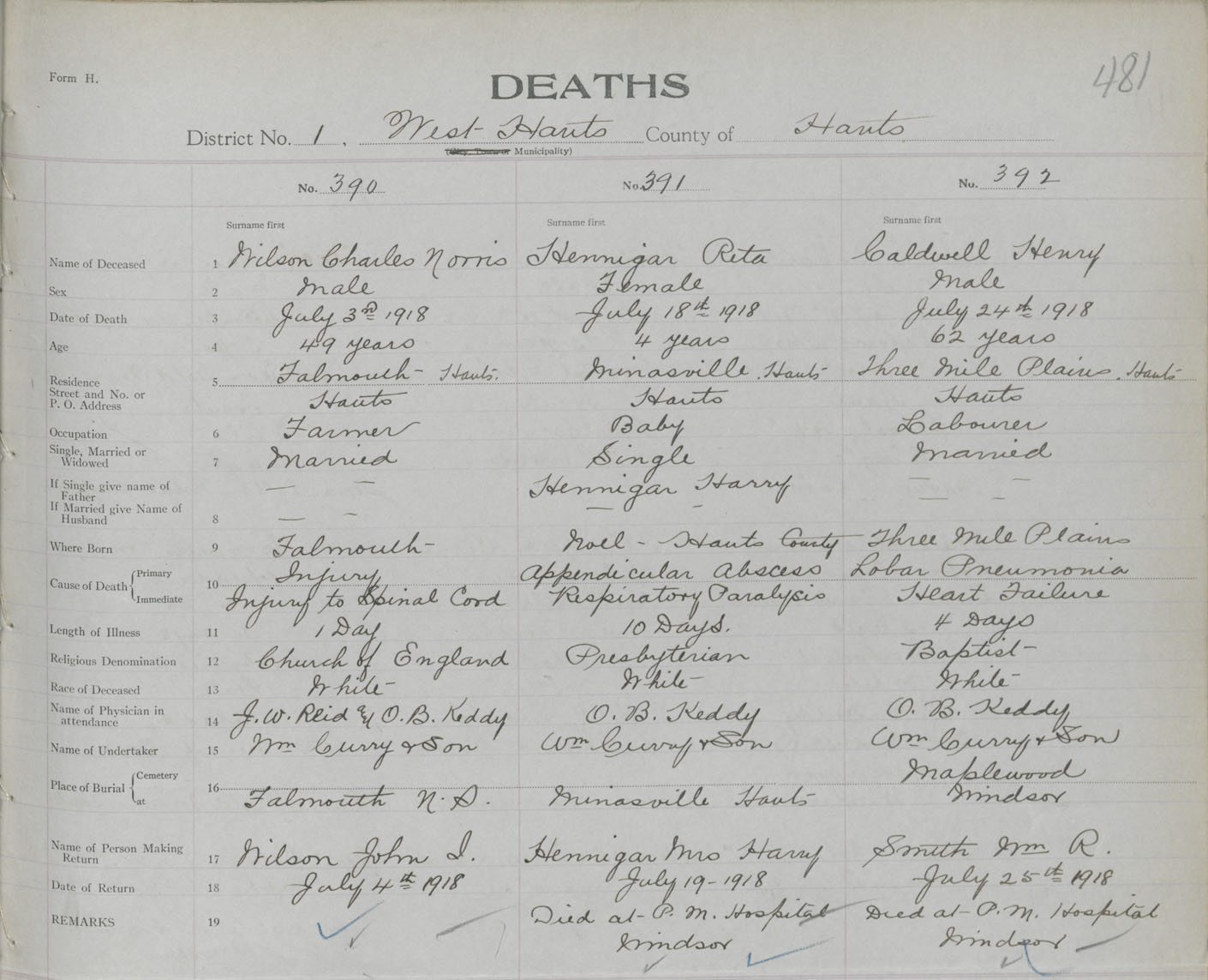 Male Death Registration: Year: 1918 book: 35 page: 481 number: 390