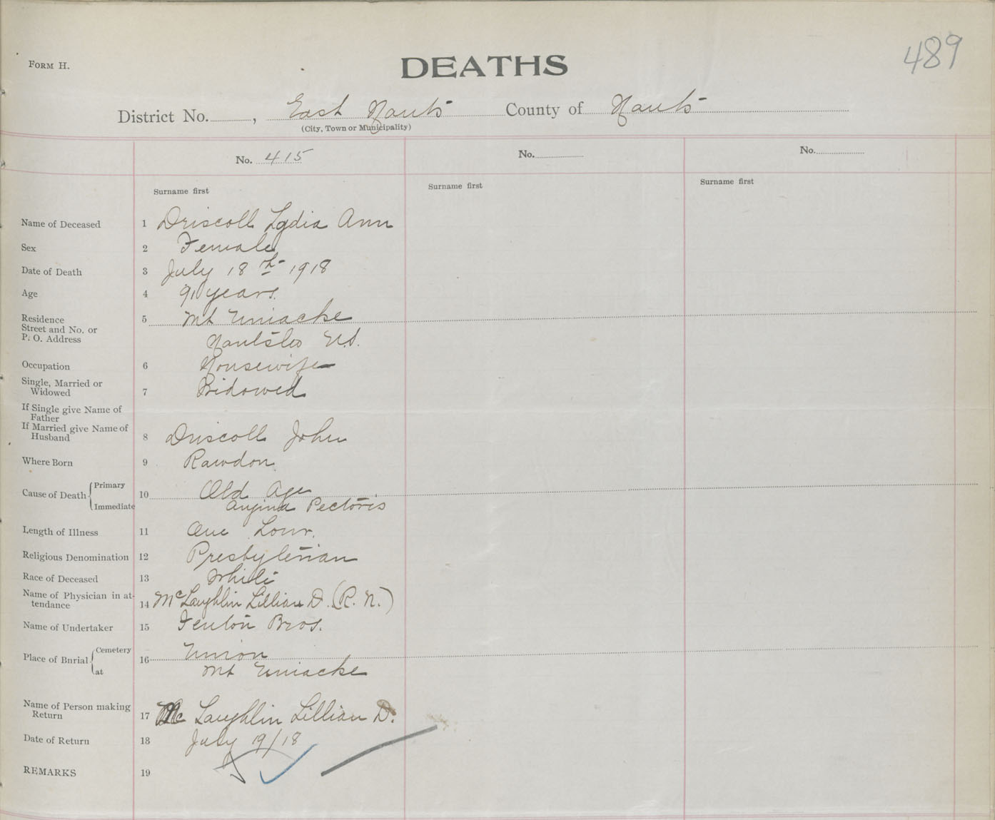 Female Death Registration: Year: 1918 book: 35 page: 489 number: 415