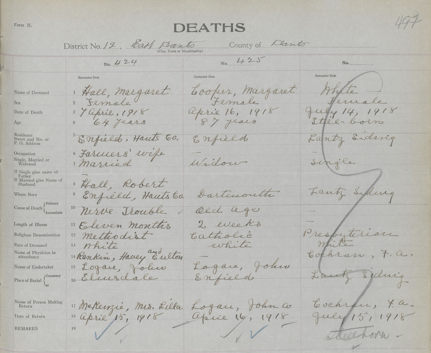 Female Death Registration: Year: 1918 book: 35 page: 497 number: 424