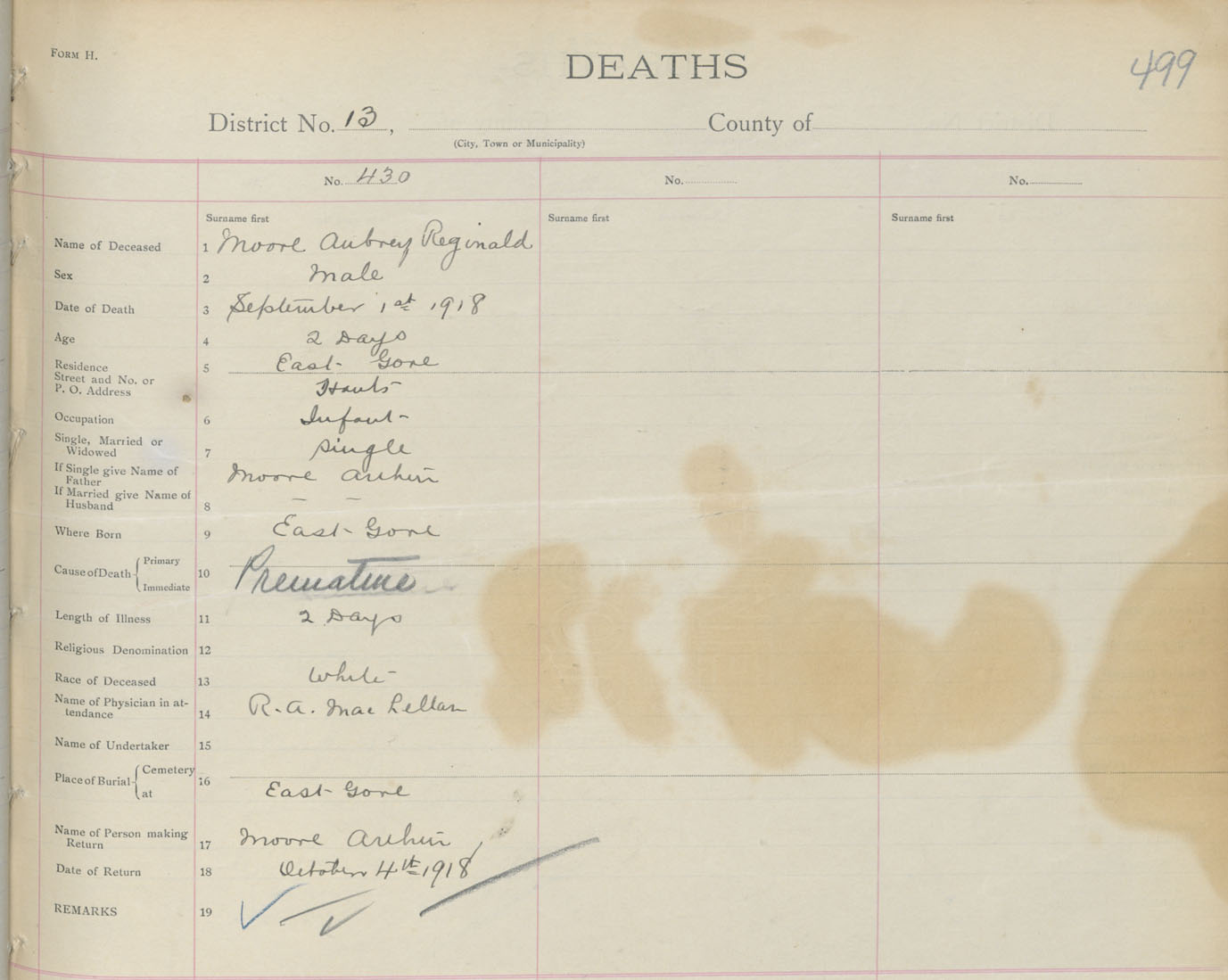Male Death Registration: Year: 1918 book: 35 page: 499 number: 430