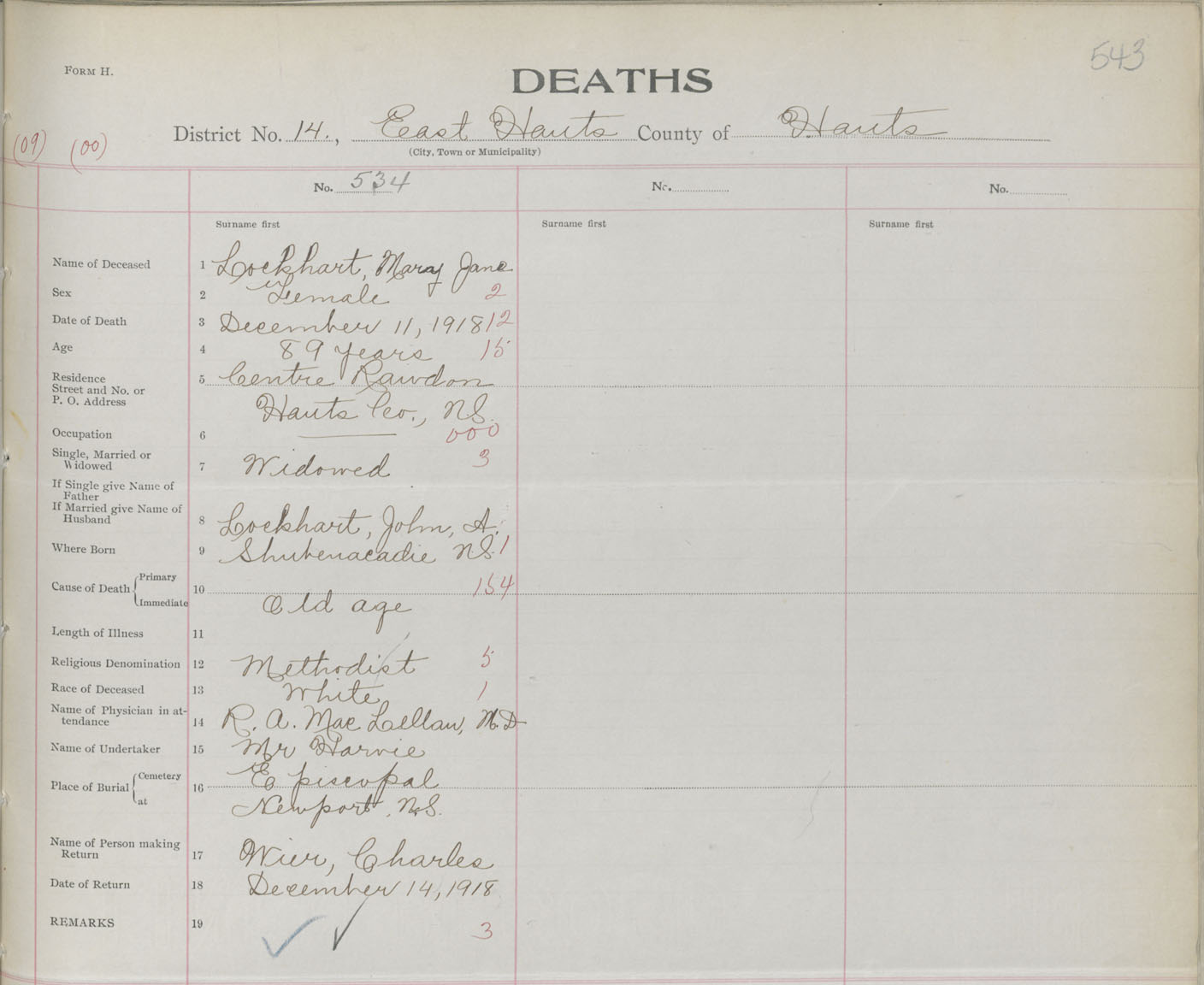 Female Death Registration: Year: 1918 book: 35 page: 543 number: 534
