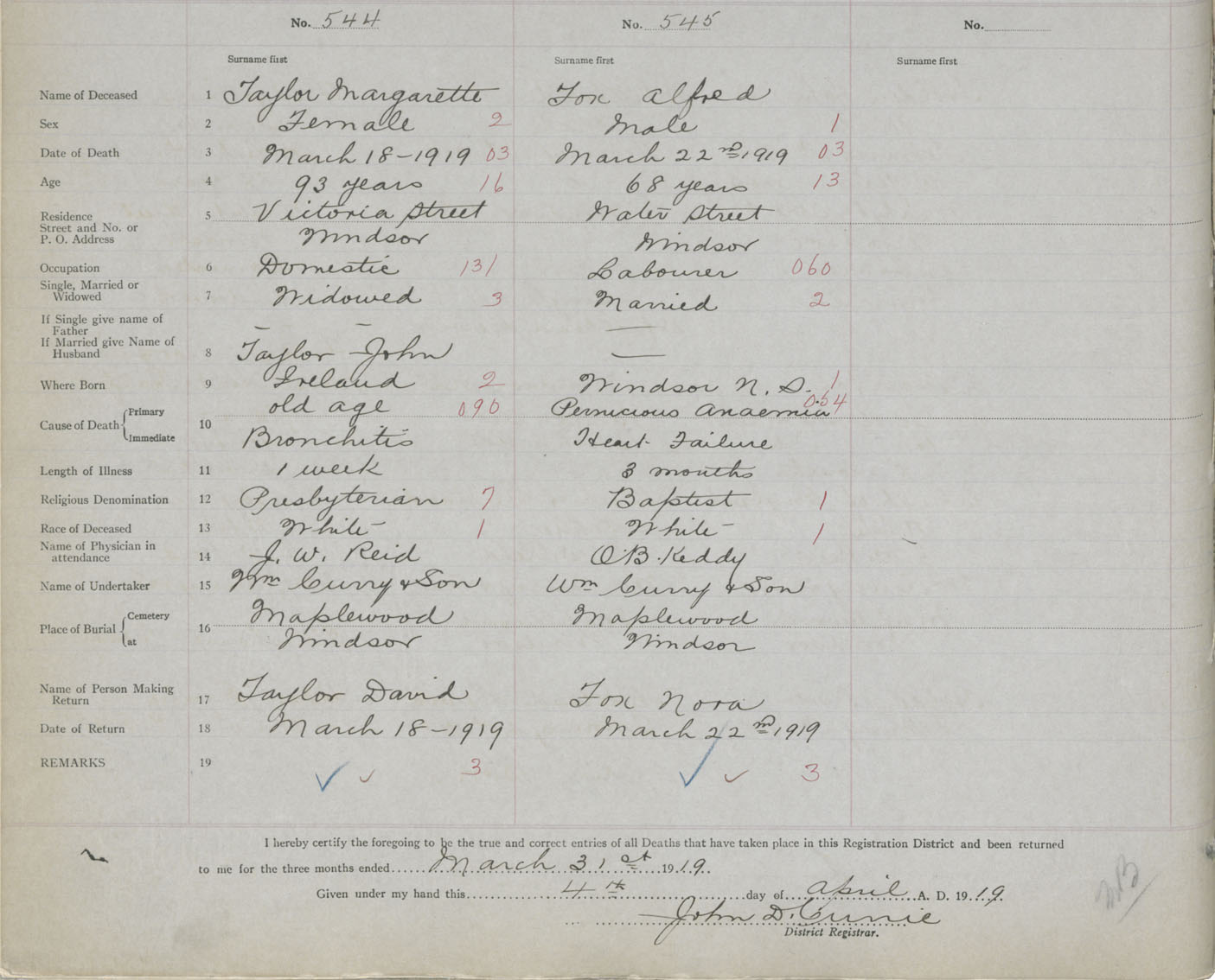 Male Death Registration: Year: 1919 book: 35 page: 548 number: 545