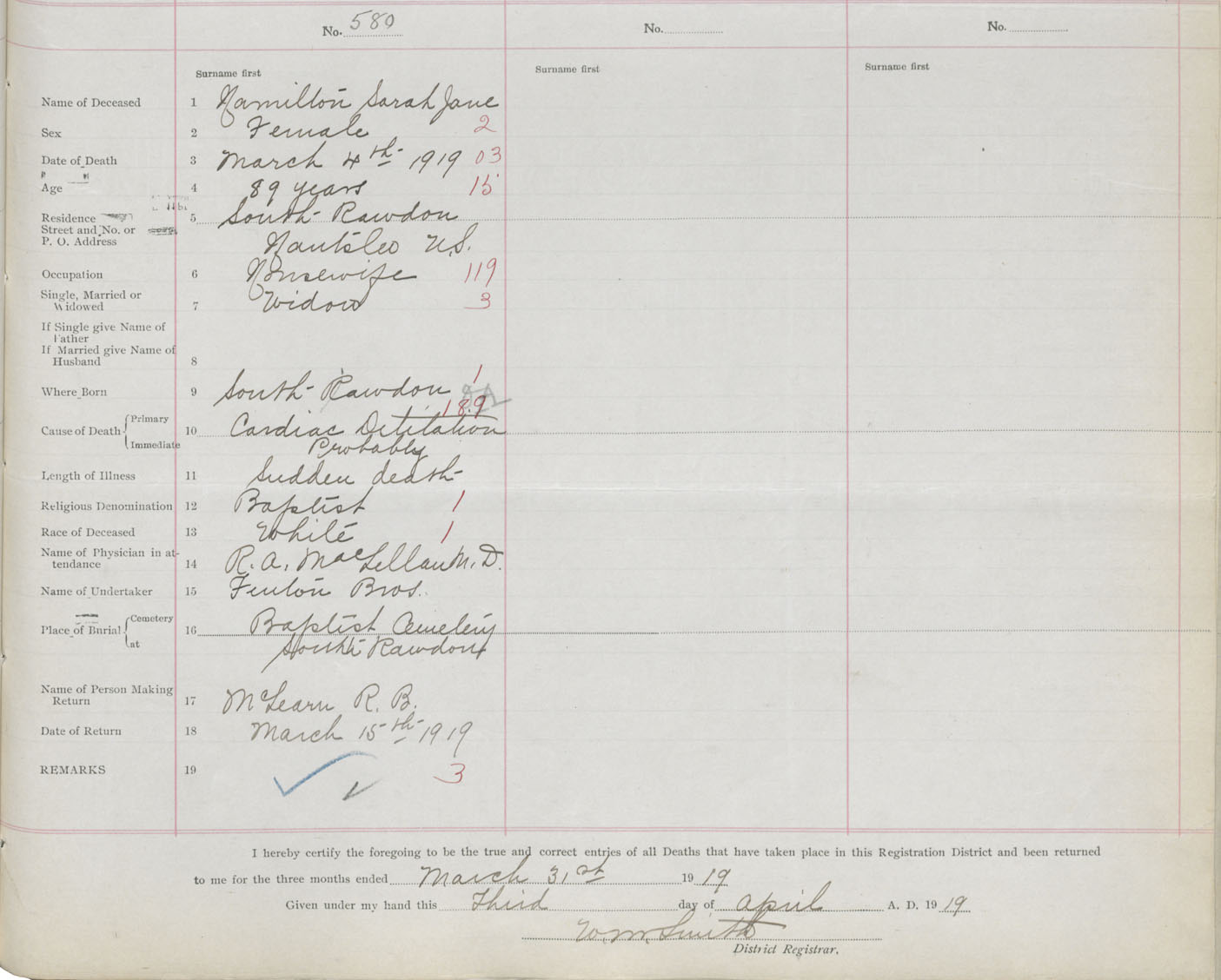 Female Death Registration: Year: 1919 book: 35 page: 561 number: 580