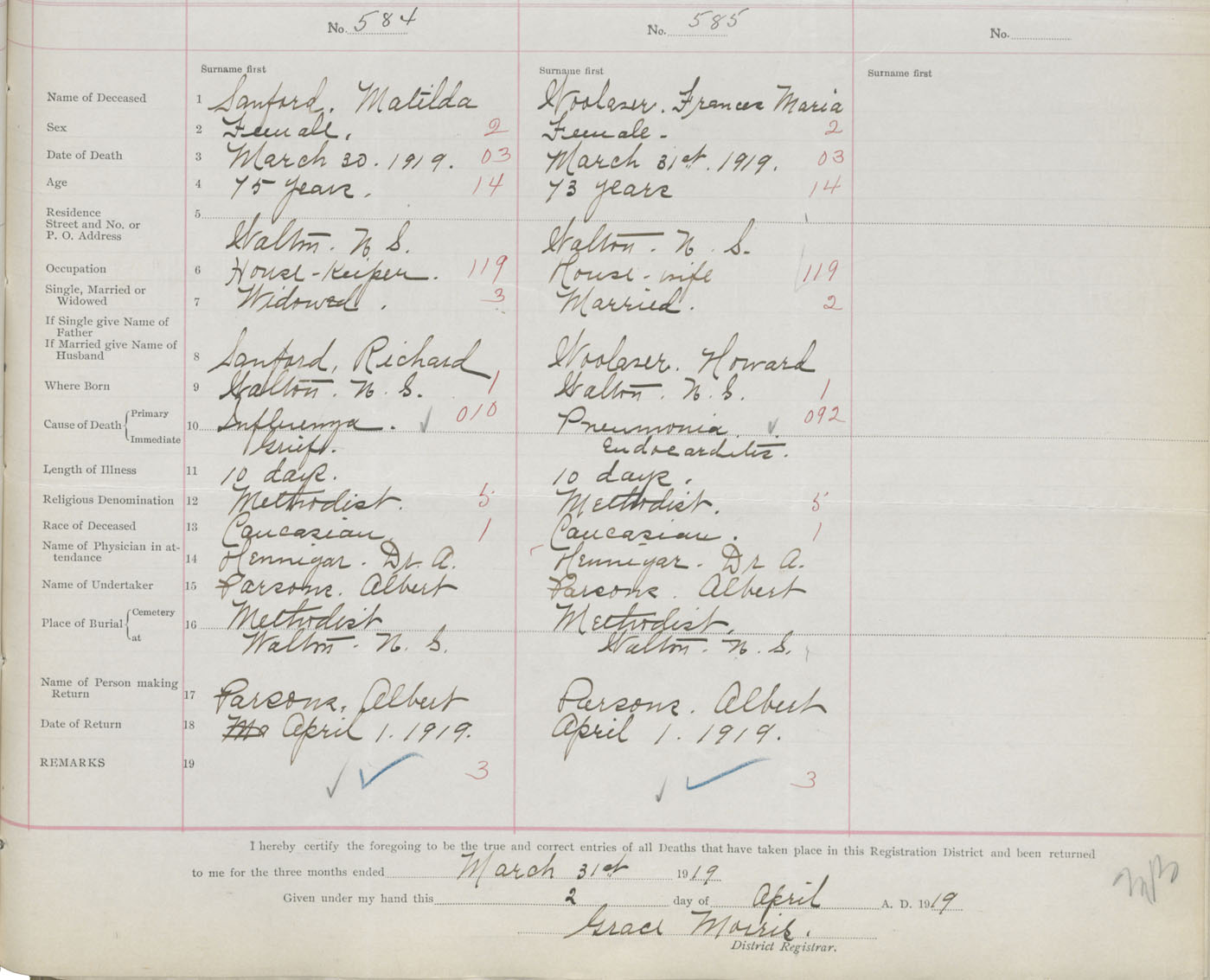 Female Death Registration: Year: 1919 book: 35 page: 563 number: 585