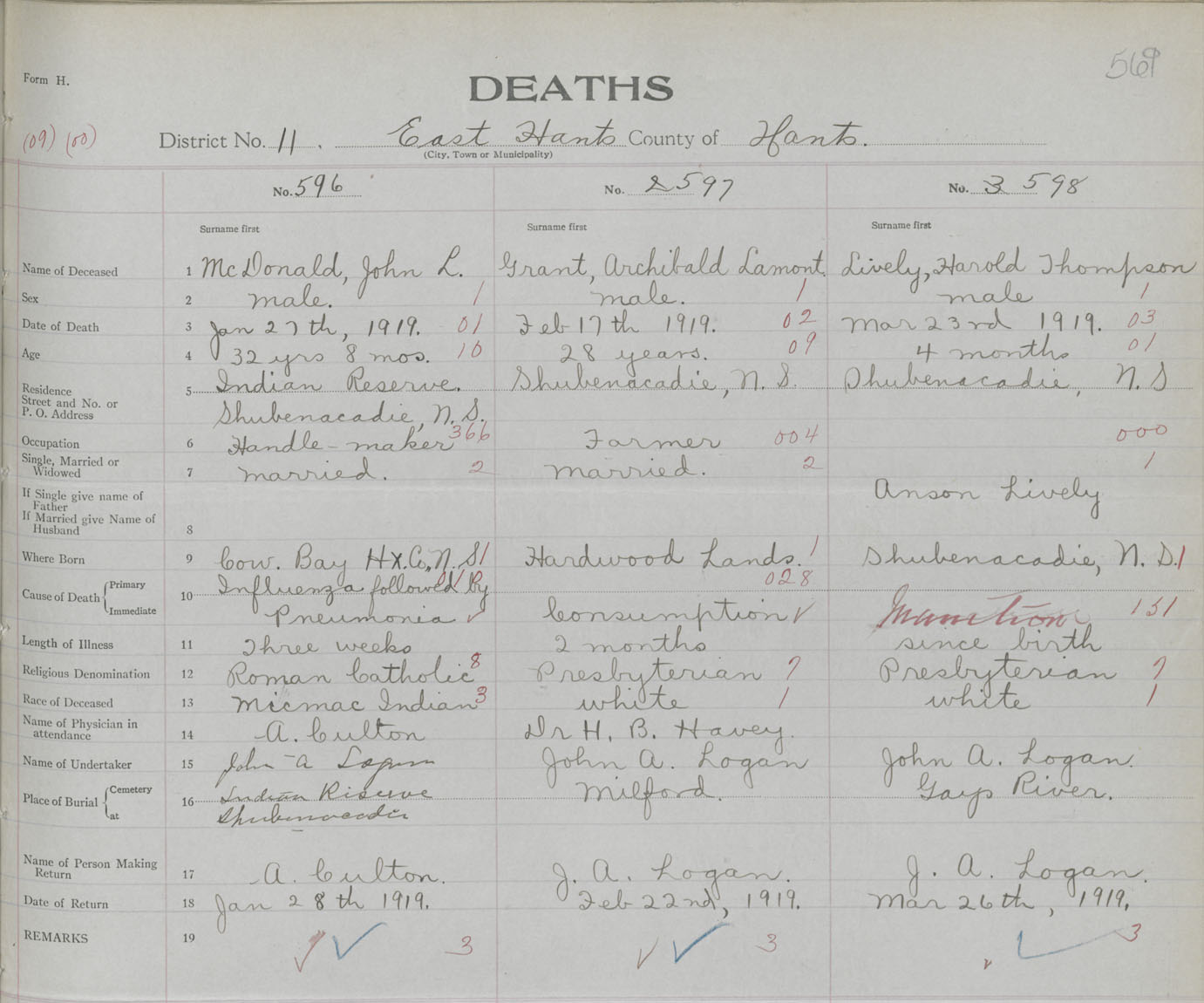 Male Death Registration: Year: 1919 book: 35 page: 569 number: 598