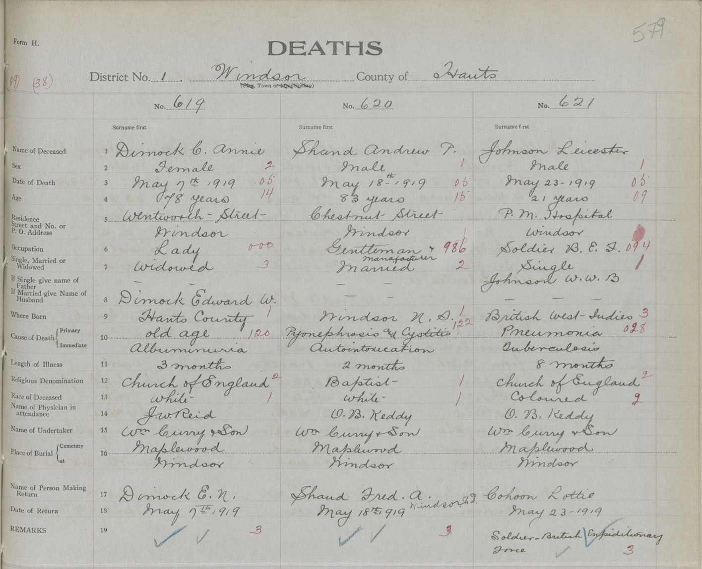 Male Death Registration: Year: 1919 book: 35 page: 579 number: 621