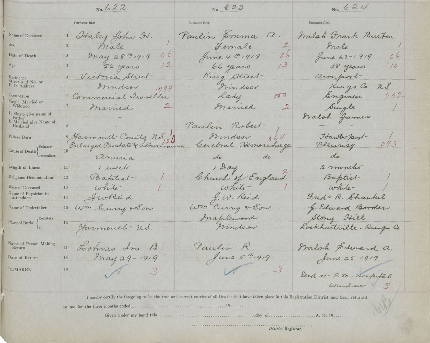 Male Death Registration: Year: 1919 book: 35 page: 579 number: 624