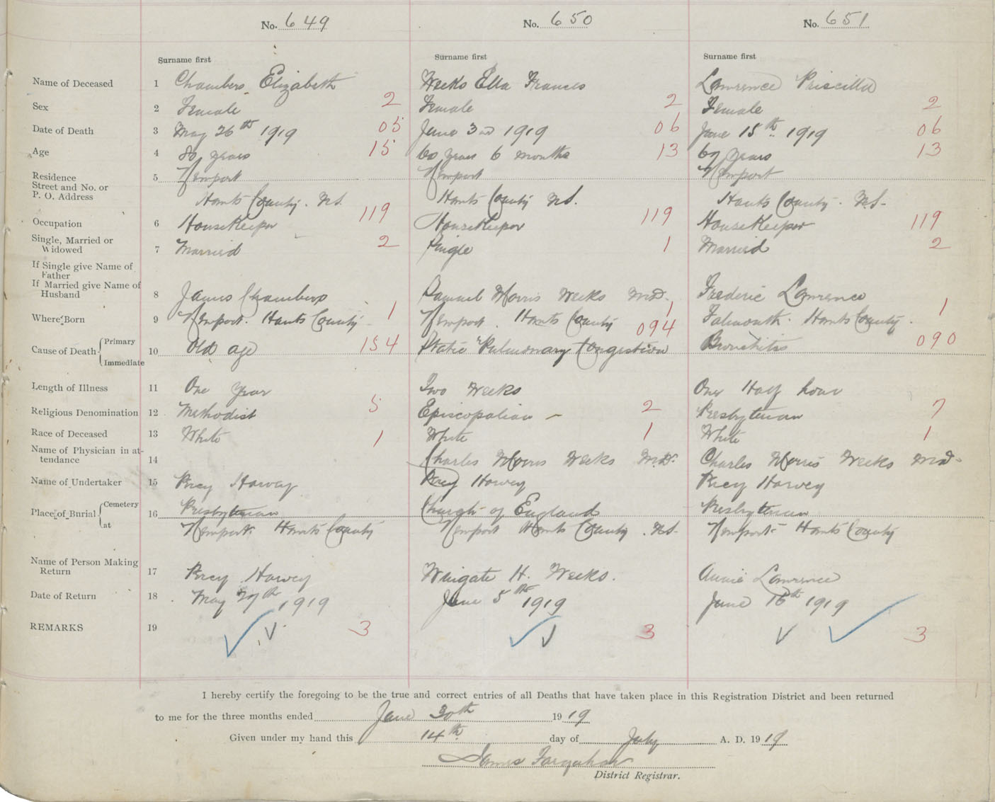 Female Death Registration: Year: 1919 book: 35 page: 589 number: 651