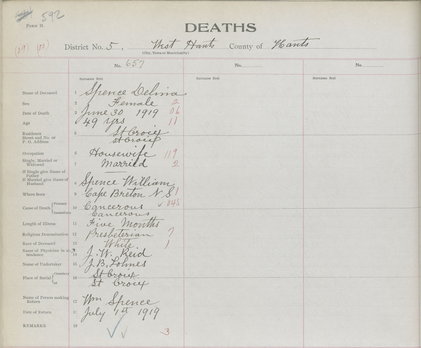 Female Death Registration: Year: 1919 book: 35 page: 592 number: 657