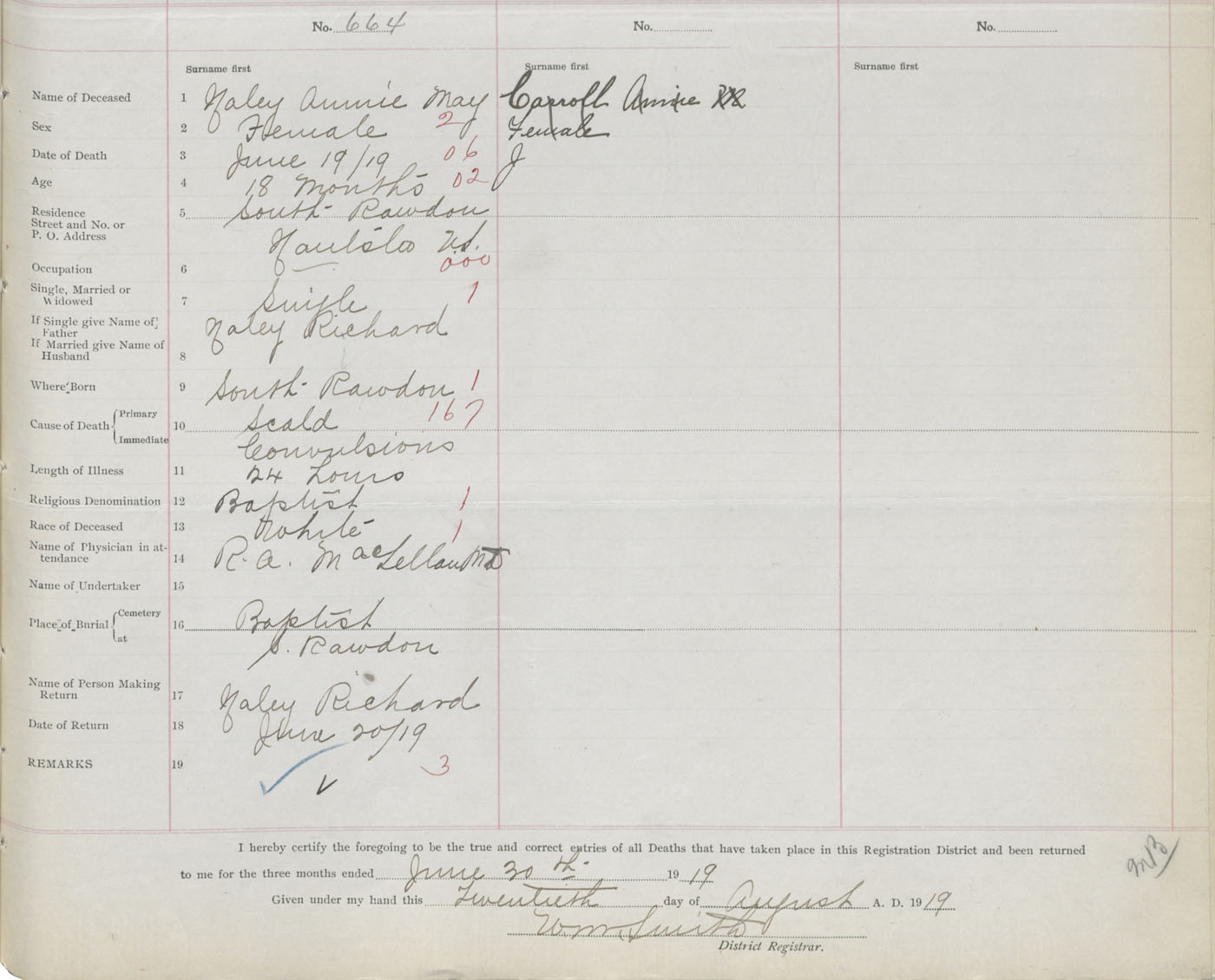 Female Death Registration: Year: 1919 book: 35 page: 595 number: 664