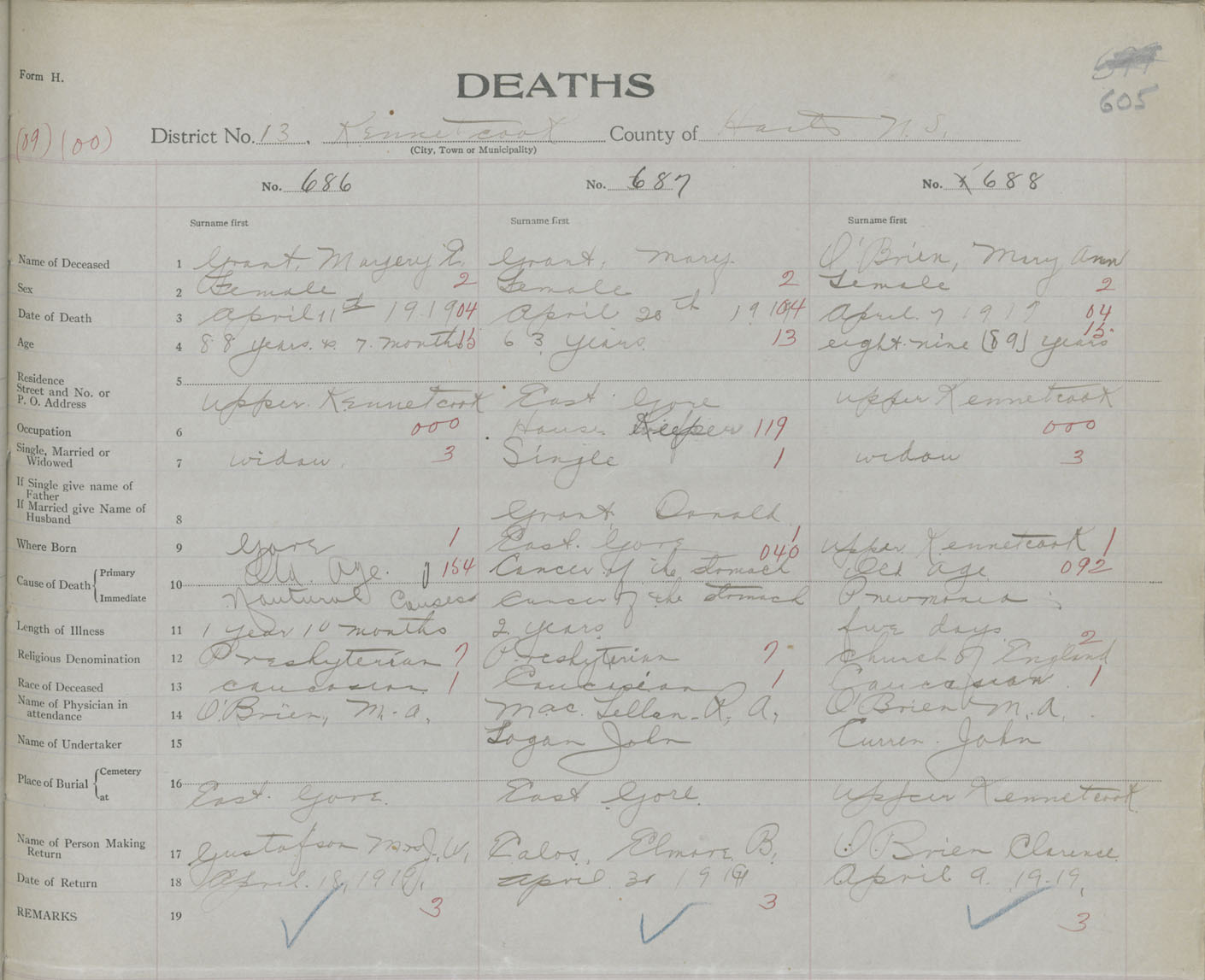 Female Death Registration: Year: 1919 book: 35 page: 605 number: 688