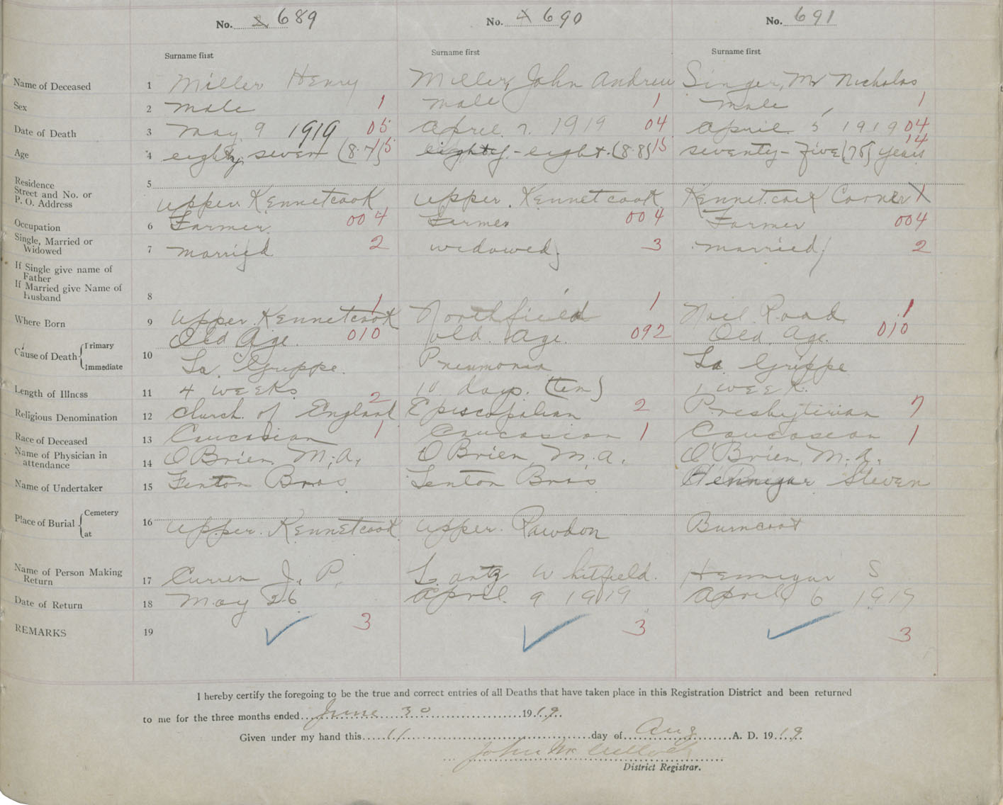 Male Death Registration: Year: 1919 book: 35 page: 605 number: 691
