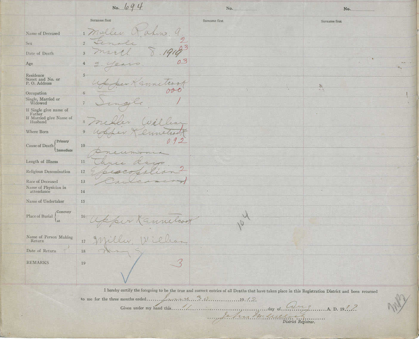 Male Death Registration: Year: 1919 book: 35 page: 606 number: 694
