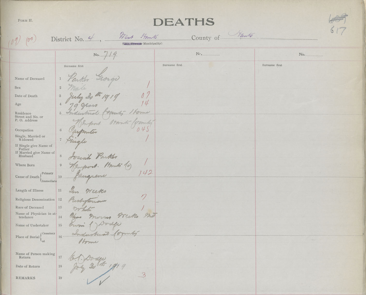 Male Death Registration: Year: 1919 book: 35 page: 617 number: 719