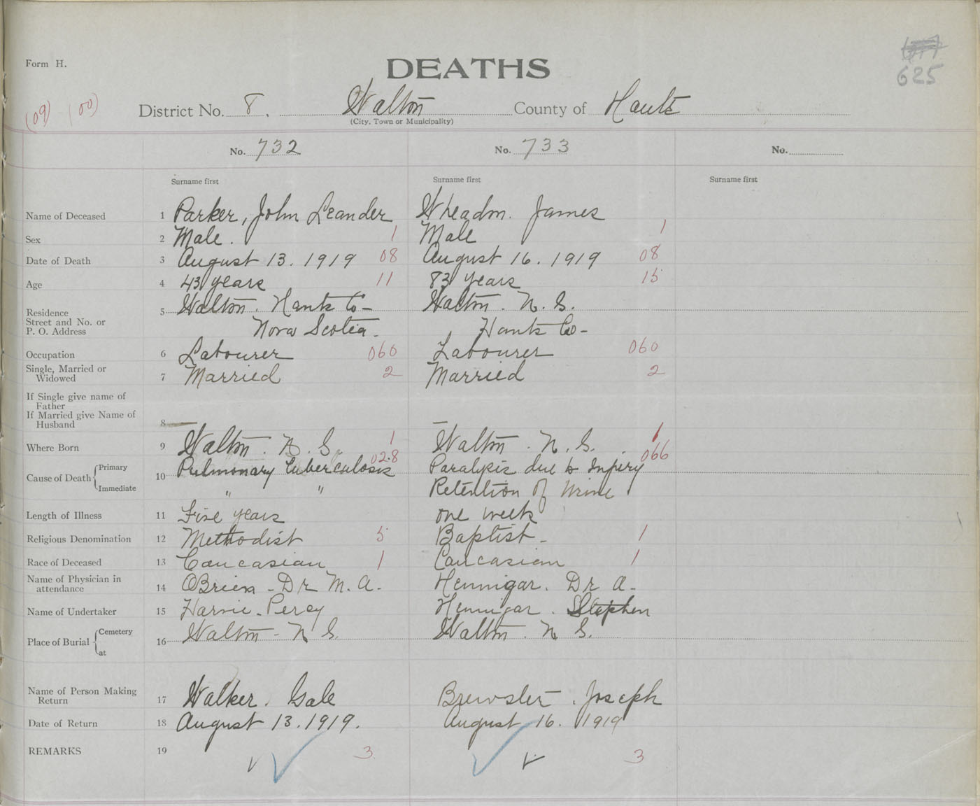 Male Death Registration: Year: 1919 book: 35 page: 625 number: 732